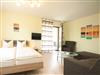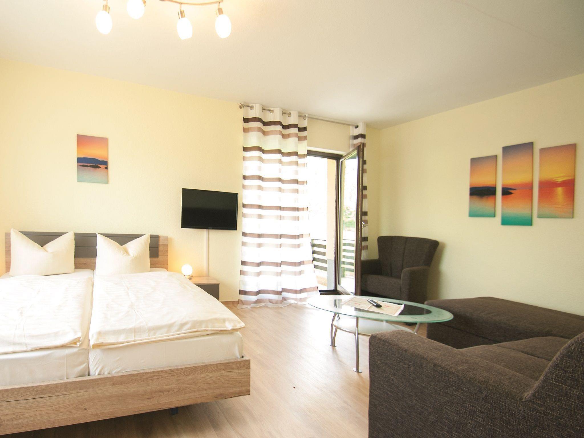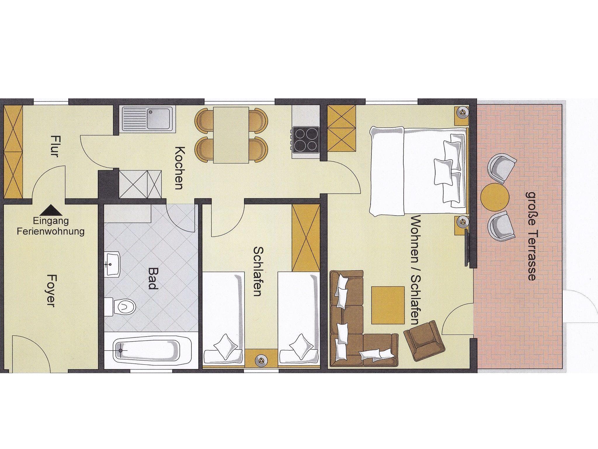 Die Fewo verfügt über 1 Schlafzimmer, ein kombinierter Wohn-/Schlafraum mit Couch und TV, 1 Badezimmer mit Badewanne/WC, Küche mit Geschirrspüler, 4-Platten E-Herd und Essecke