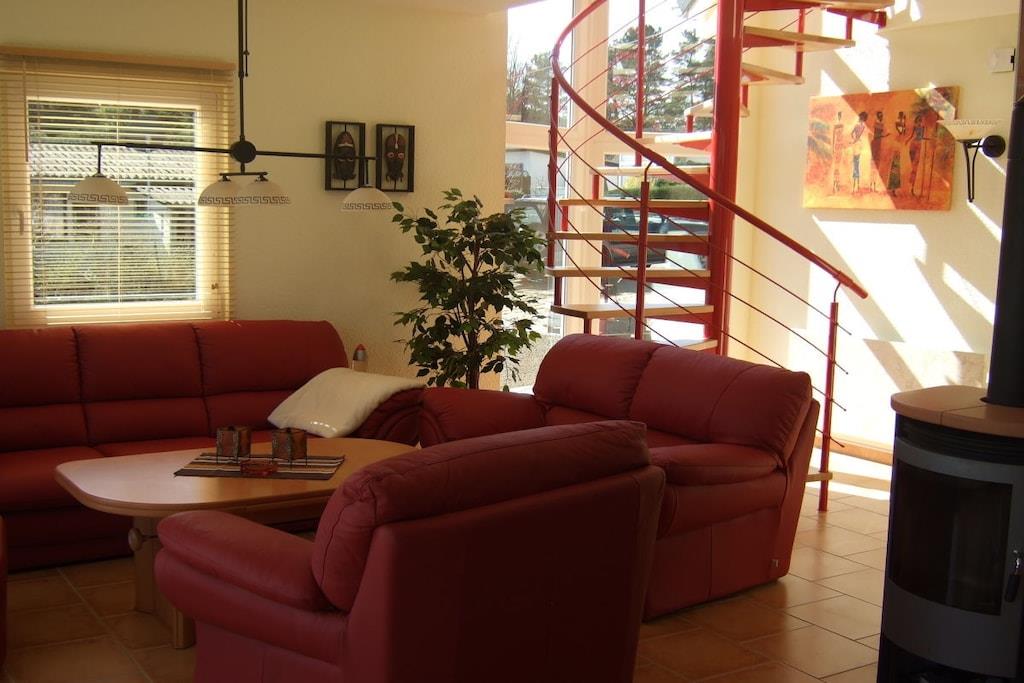 Parterre: (Eingangshalle(, ), Küche(Herd, Kochplatte, Spülmaschine, Kühlschrank), Wohn/Esszimmer(, TV, Esstisch, Kaminofen), Schlafzimmer(, , Doppelbett), Badezimmer(, Toilette, Dusche, Waschbecken), Ruheraum(Sauna), Abstellraum) In der 1. Etage: (Eingangshalle, Schlafzimmer(, , Doppelbett), Schlafzimmer(, , Einzelbett, Einzelbett), Badezimmer(, Toilette, Badewanne, Waschbecken)) , , Internet, Waschmaschine, Balkon(Gartenmöbel), Terrasse(Gartenmöbel, Markise), Garten(Zentraler Grill, Liegewiese, Gartenmöbel, Liegen, Gartenhaus), Bügelbrett, Bügeleisen, Trockenschrank