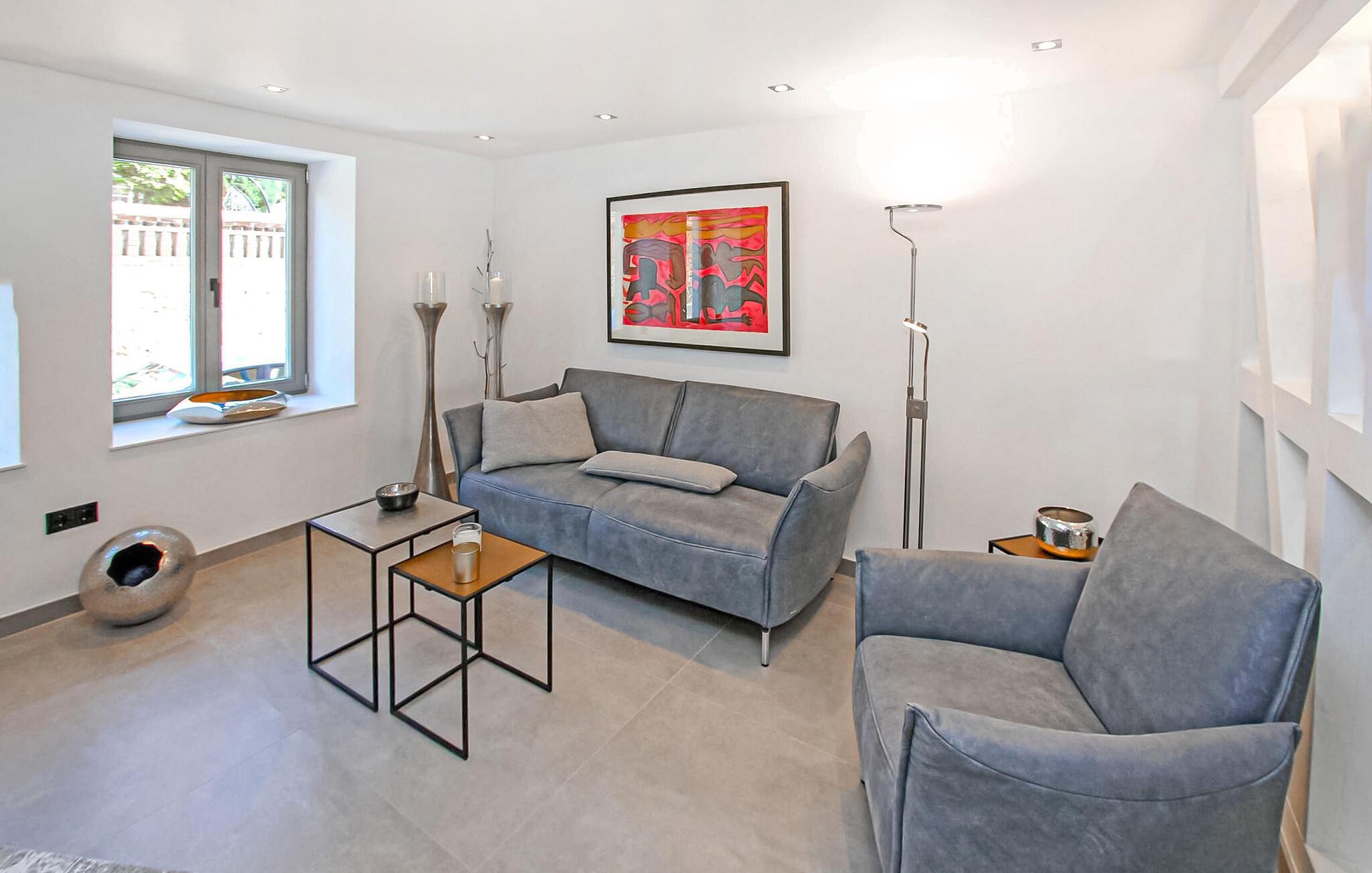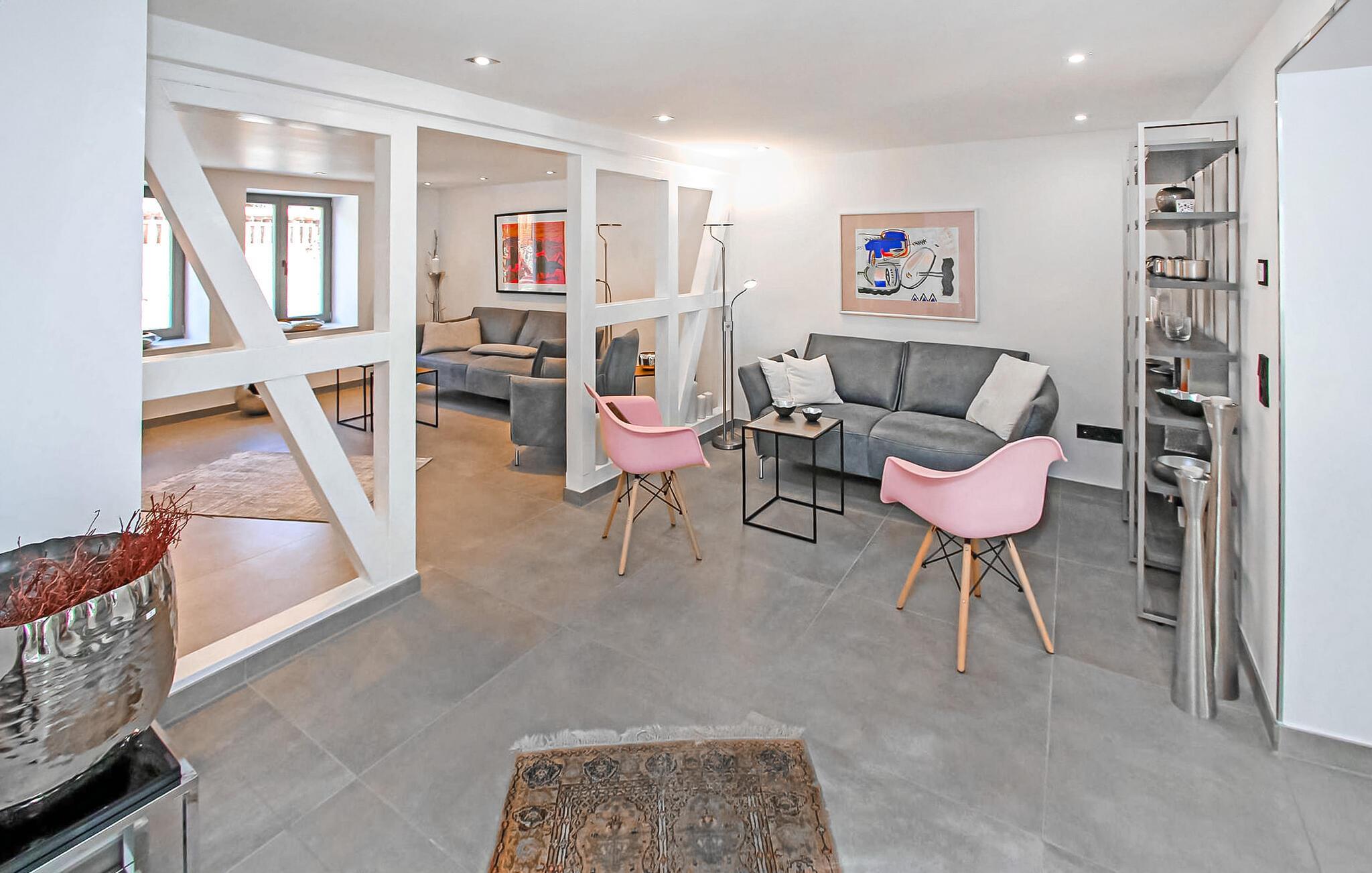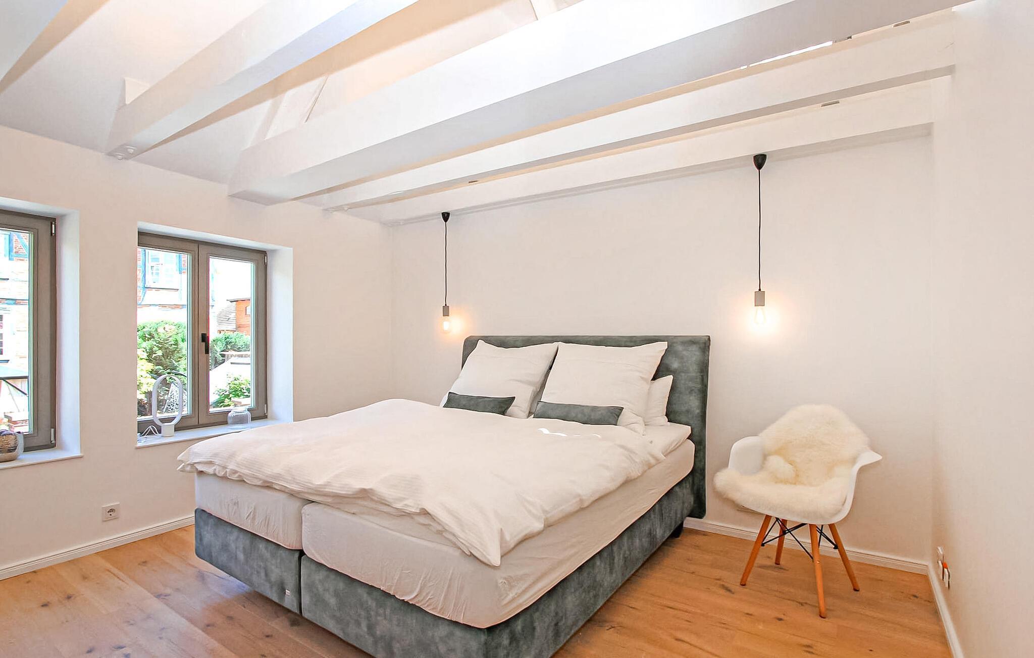 Das historische Gebäude wurde bis 2021 sehr aufwändig saniert und im modern-minimalistischen Stil eingerichtet. Die hochwertige Ausstattung genügt gehobenen Ansprüchen. Erstbezug Juli 2021. Das Erdgeschoss verfügt über einen offenen Zuschnitt. Hier befinden sich zwei Wohnbereiche (Polstermöbel, Sitzecken, Smart-TV), eine hochmoderne Küche (u.a. E-Kochfeld mit integriertem Bora Dunstabzug, Backofen, internetfähiger Kühlschrank mit Eiswürfelspender, großer Esstisch, div. Küchengeräte), ein kleines Gäste-WC, 1 Schlafraum mit Doppelbett (Durchgangszimmer zum Bad) und ein Bad mit offener Dusche und Waschmaschine. Im Obergeschoss gibt es zwei weitere Schlafräume (je Doppelbett, Flachbild-TV) und ein Bad mit freistehender Badewanne, offener Dusche und LED-Spiegel mit integriertem Kosmetikspiegel. Für Kleinkinder stehen ein Kinderbett und ein Kinderhochstuhl bereit. Für größere Kinder bis 10 Jahre können zusätzlich Gästebetten zugestellt werden.