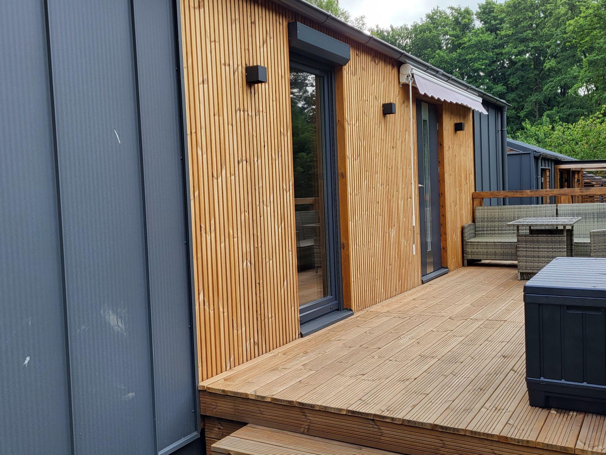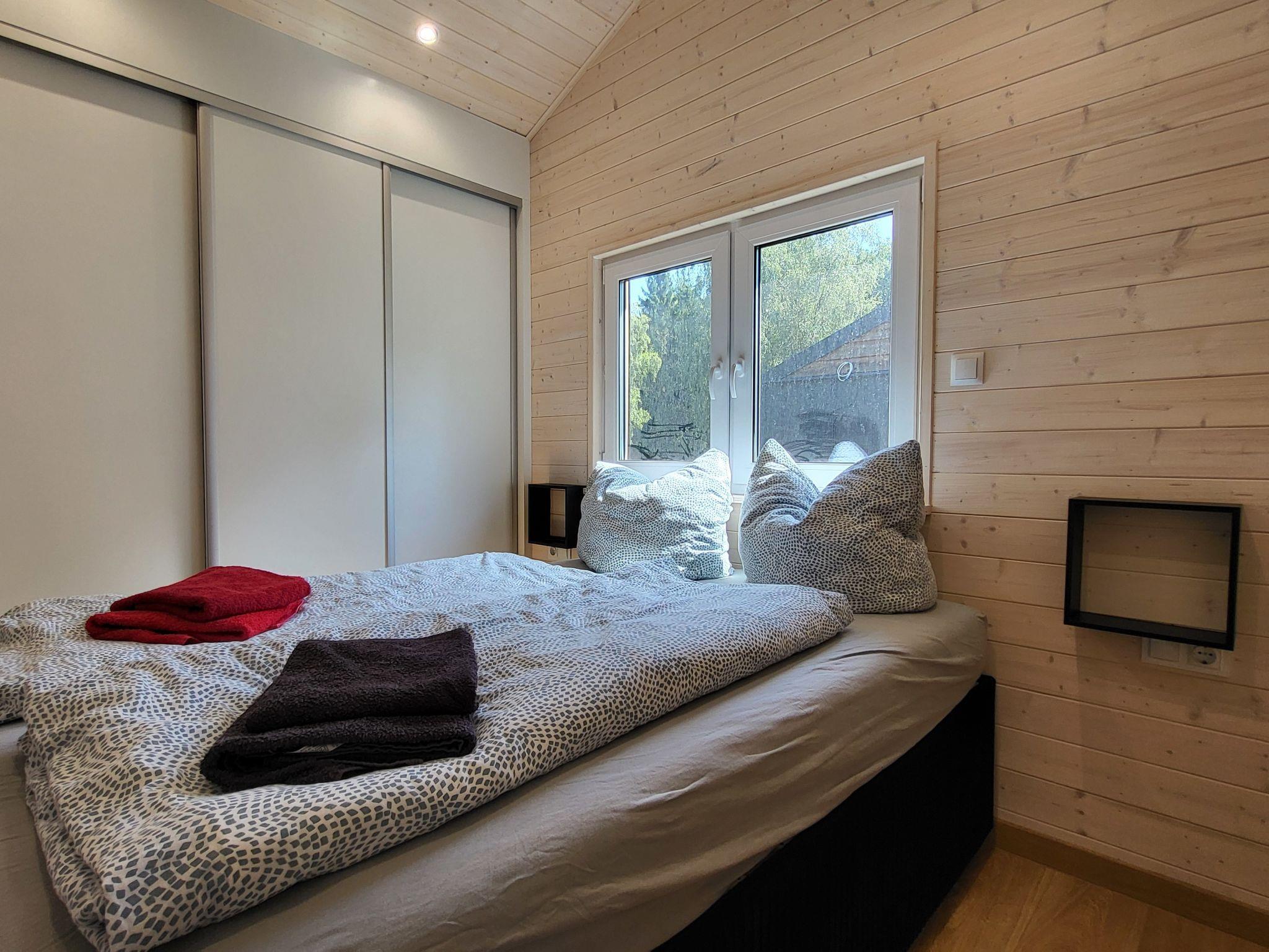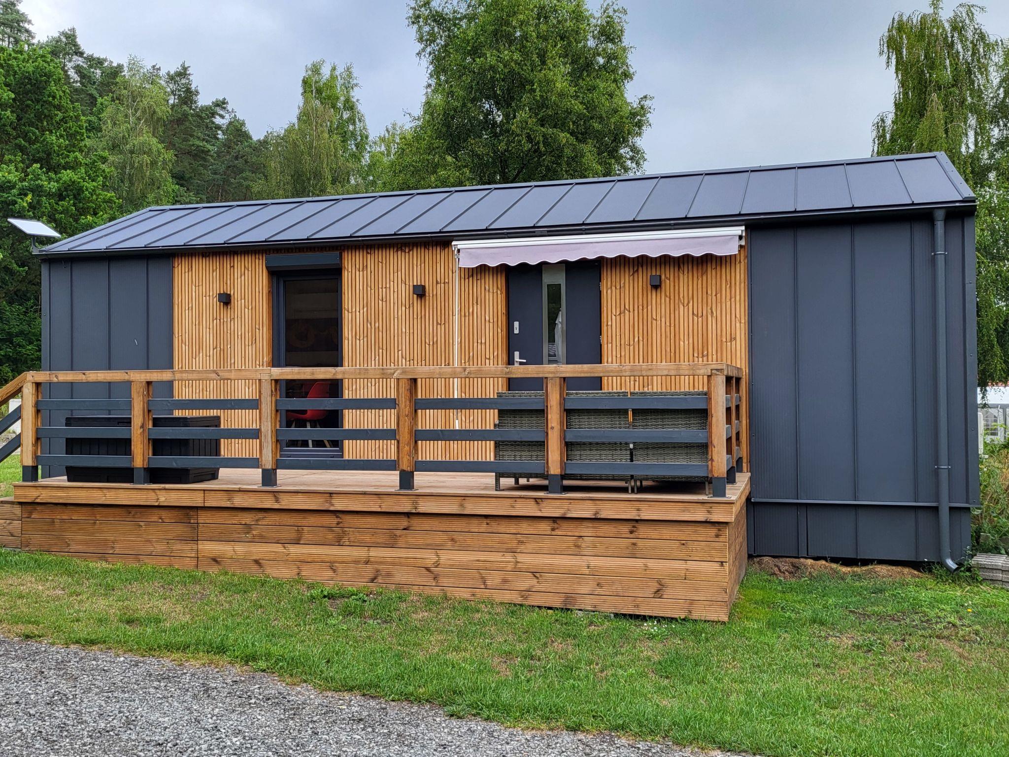 "Haus 41 Fiete", 3-Zimmer-Mobilheim. Modern und geschmackvoll eingerichtet: Wohn-/Schlafzimmer mit 1 Doppeldiwanbett (180 cm, Länge 200 cm), Sat-TV. Ausgang zur Terrasse. 1 Zimmer mit 1 Bett (90 cm, Länge 200 cm). 1 Zimmer mit 1 Doppelbett (160 cm, Länge 200 cm), Sat-TV. Offene Küche (Backofen, Geschirrspüler, 4 Induktionskochplatten, Toaster, Wasserkocher). Dusche/WC. Heizung. Terrasse 12 m2. Sehr schöne Sicht auf den Wald. Zur Verfügung: Internet (WLAN). Parkplatz beim Haus. Maximal 1 Haustier/Hund erlaubt.