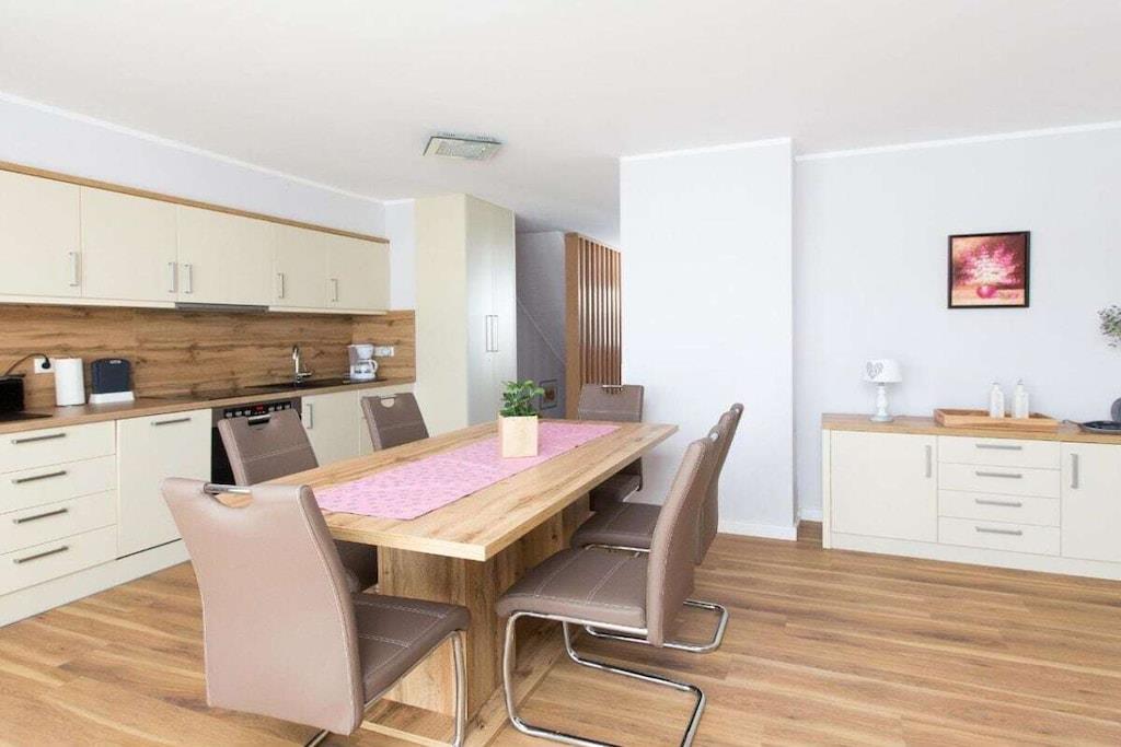 In der 1. Etage: (Wohnzimmer(, Schlafcouch 1 Pers., TV), Küche(Kochplatte, Kochherd, Backofen, Spülmaschine, Kühlschrank), Schlafzimmer(, , Doppelbett, TV), Schlafzimmer(, , Doppelbett, TV)) , , , , Badezimmer(, Toilette, Badewanne, Dusche, Waschbecken), Badezimmer(, Toilette, Badewanne, Dusche, Waschbecken), Internet, Erste-Hilfe-Station, Waschmaschine, Balkon(Balkon), Heizung, Parkplatz, Bügelbrett, Bügeleisen, Trockenschrank