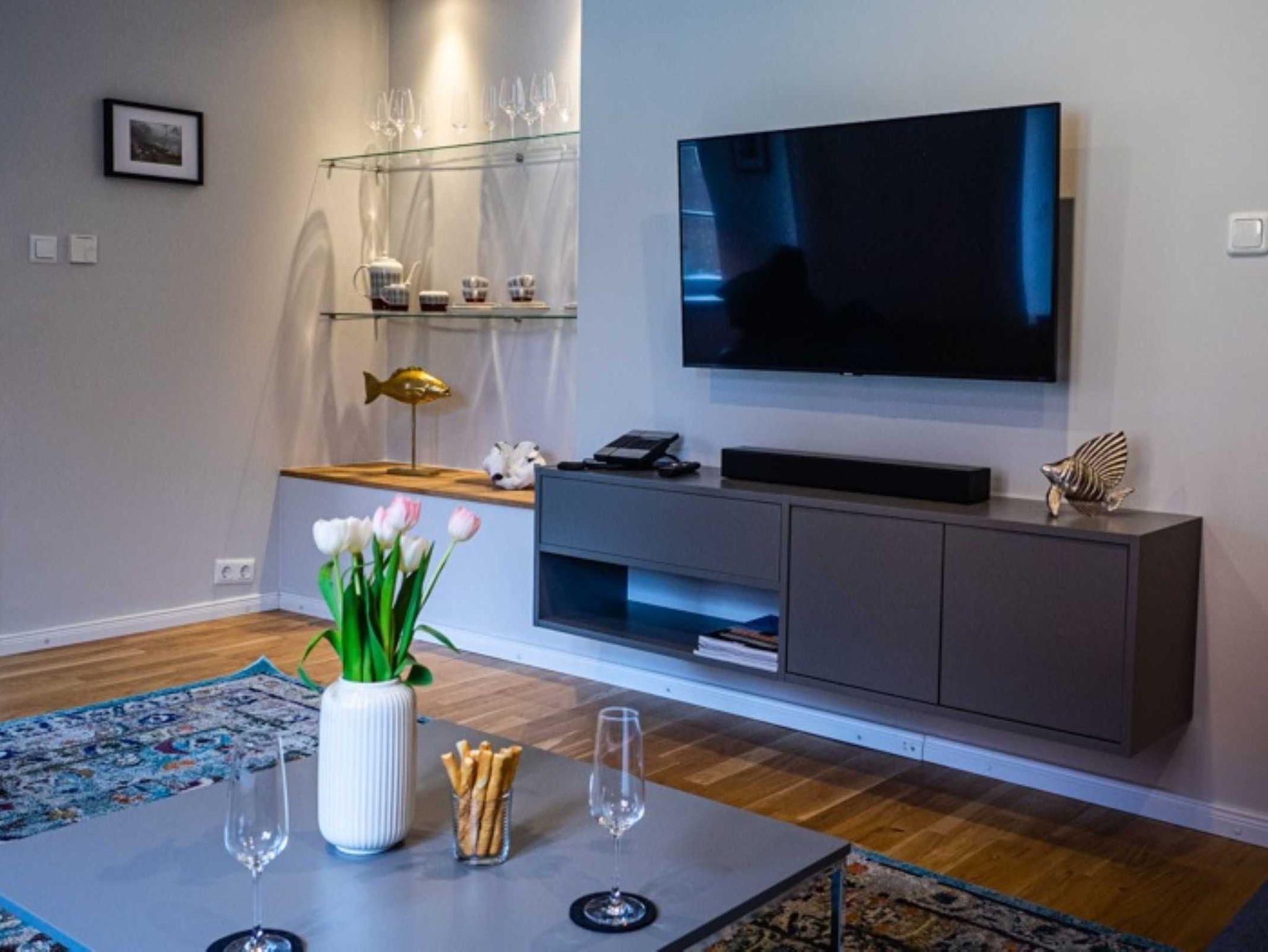 - Wohnzimmer mit Essbereich: gemütliches Ecksofa, Satelliten-TV mit Smart-Funktion, Esstisch mit 4 Stühlen sowie eine Soundbar mit Bluetooth