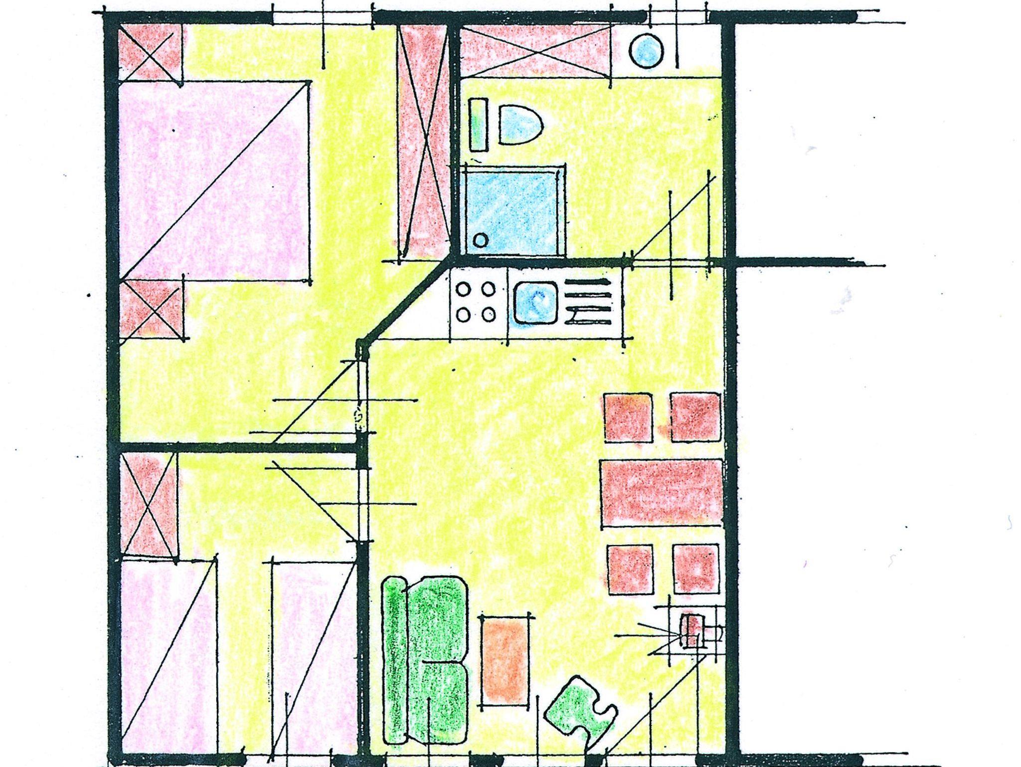 Das Ferienhaus verfügt über einen kombinierten Wohn- und Küchenbereich mit vollausgestatteter Küchenzeile, ein Schlafzimmer mit Doppelbett, ein Schlafzimmer mit 2 Einzelbetten und eine möblierte Terrasse.
