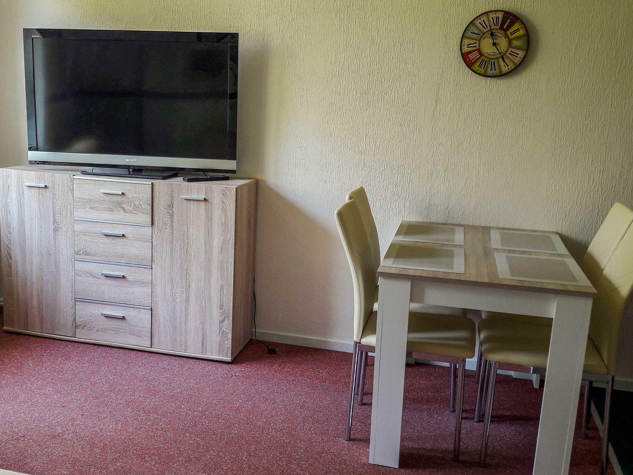 Die Ferienwohnung befindet sich im Obergschoss eines Einfamilienhauses, ist über eine Wendeltreppe erreichbar und teilt sich in Wohnraum, Schlafzimmer und Badezimmer ein. Das Wohnzimmer ist mit Couch, TV und einer Küchenzeile ausgestattet. Zur Küchenzeile gehören ein 2-Platten-Herd, Kühlschrank, Mikrowelle, Kaffeemaschine, Wasserkocher und Toaster. Im Schlafzimmer befindet sich neben einem Doppelbett (180x200, getrennte Matratzen) und einem Einzelbett (80x200) auch ein Kleiderschrank, in dem Sie Ihre Kleidung unterbringen können. Das Badezimmer verfügt über Waschbecken, WC und eine Dusche.
