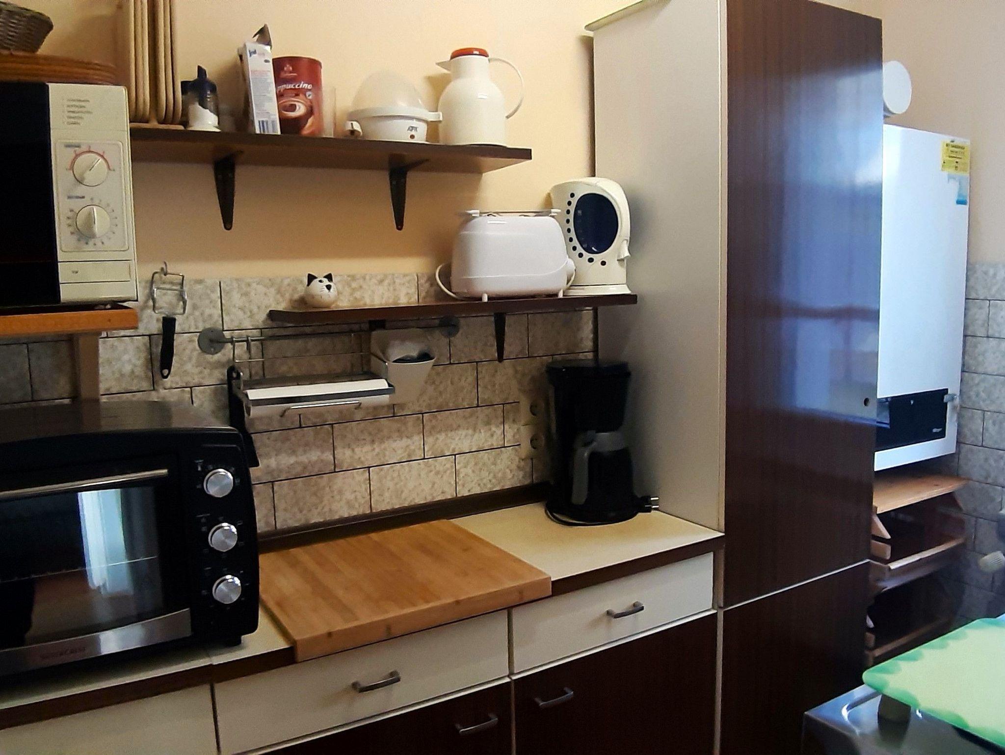 In der Küche befinden sich ein 2-Plattenkocher, ein kleiner Backofen, ein Kühlschrank mit Gefrierfach, eine Mikrowelle, eine Kaffeemaschine, ein Wasserkocher, ein Eierkocher, ein Toaster sowie ein Handmixer.