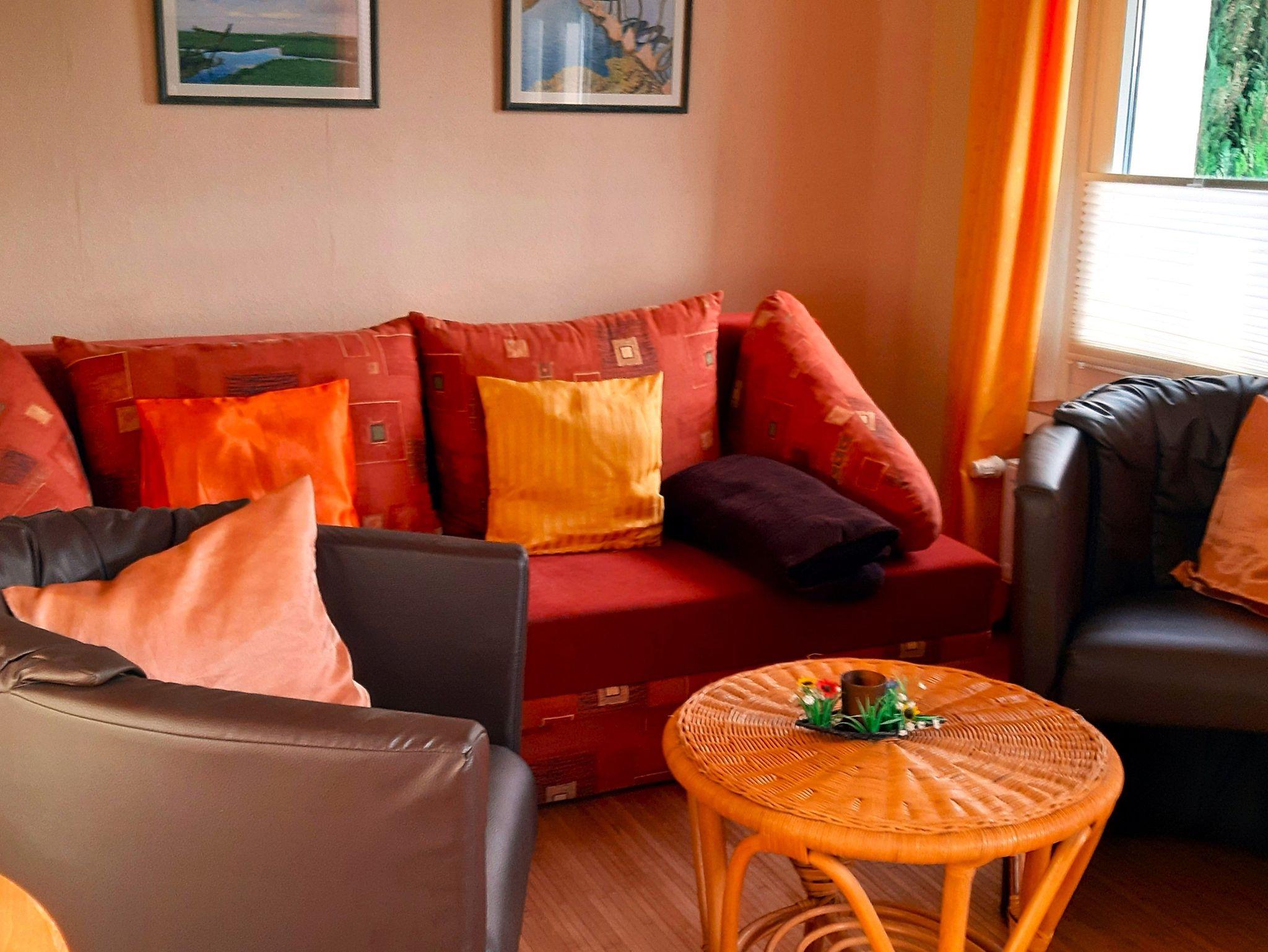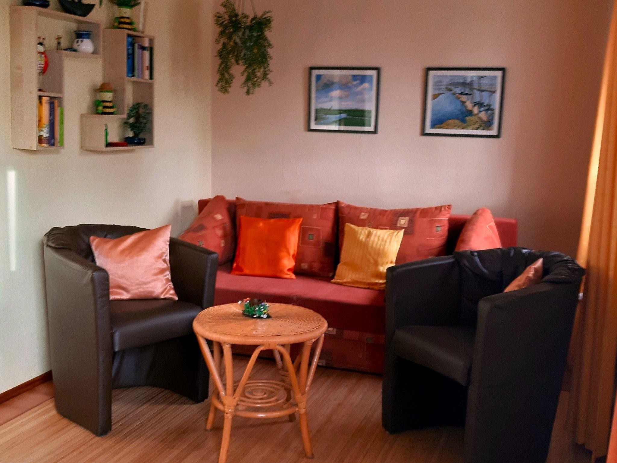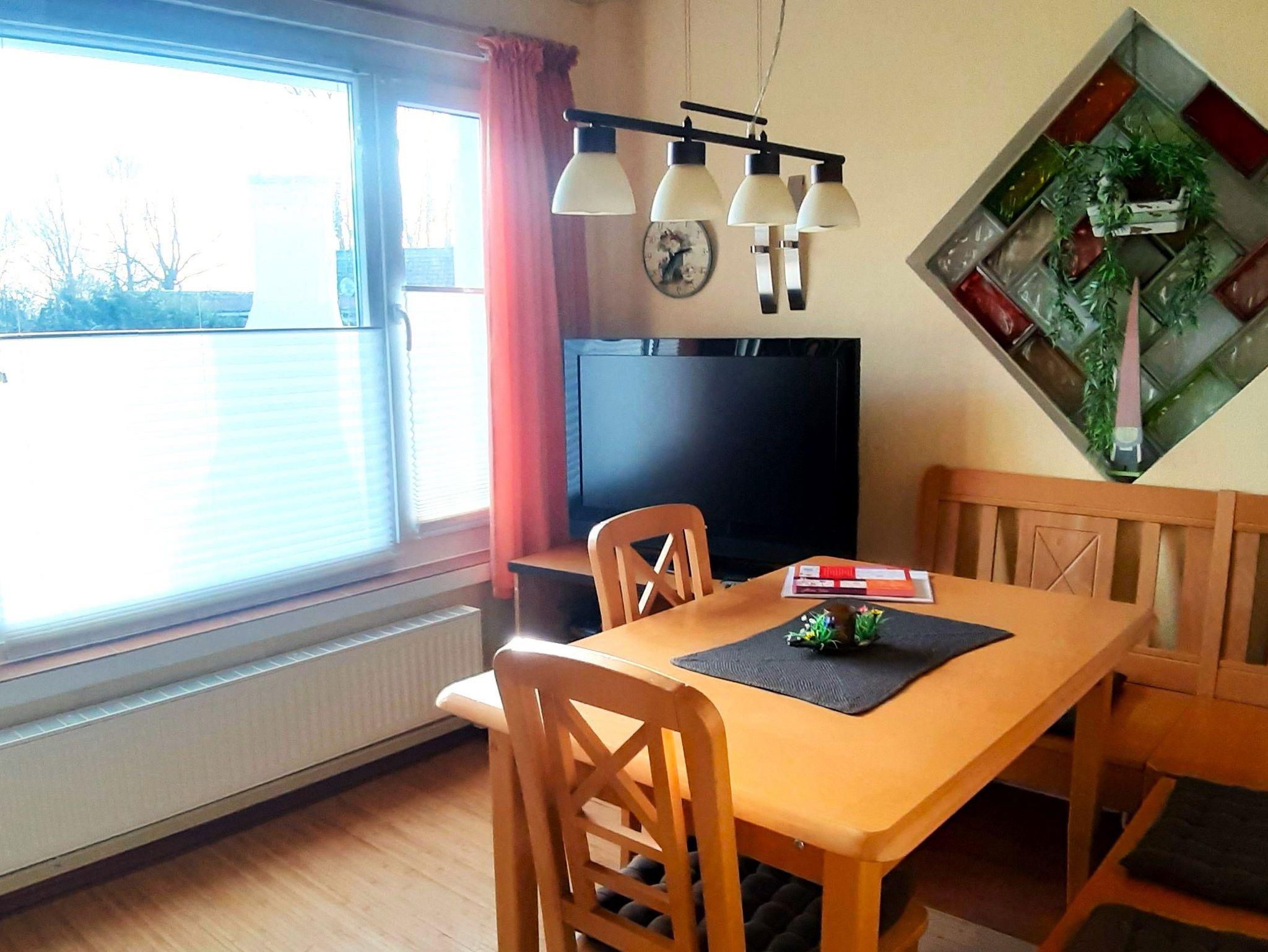 Im Wohnraum befindet sich eine Essecke mit Eckbank, eine Sitzecke mit Schlafsofa, SAT-TV und Radio mit CD- Player.