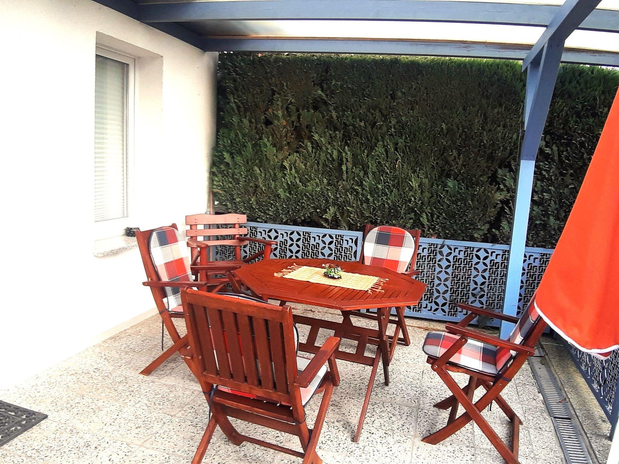 Die Terrasse ist mit einem Kamingrill,einer Teakholzsitzgruppe für 4 Personen, 2 Liegen und einem Sonnenschirm ausgestattet.