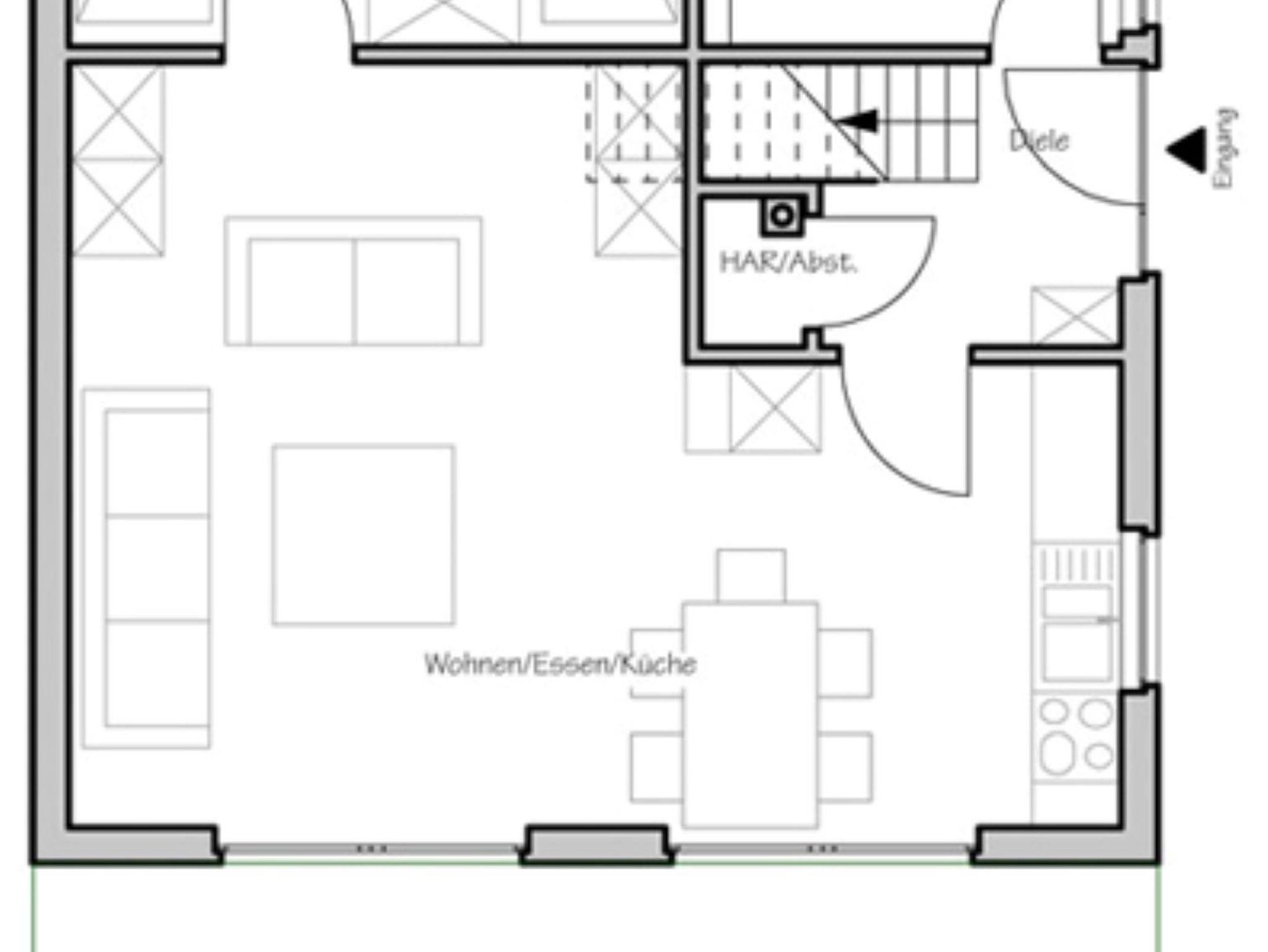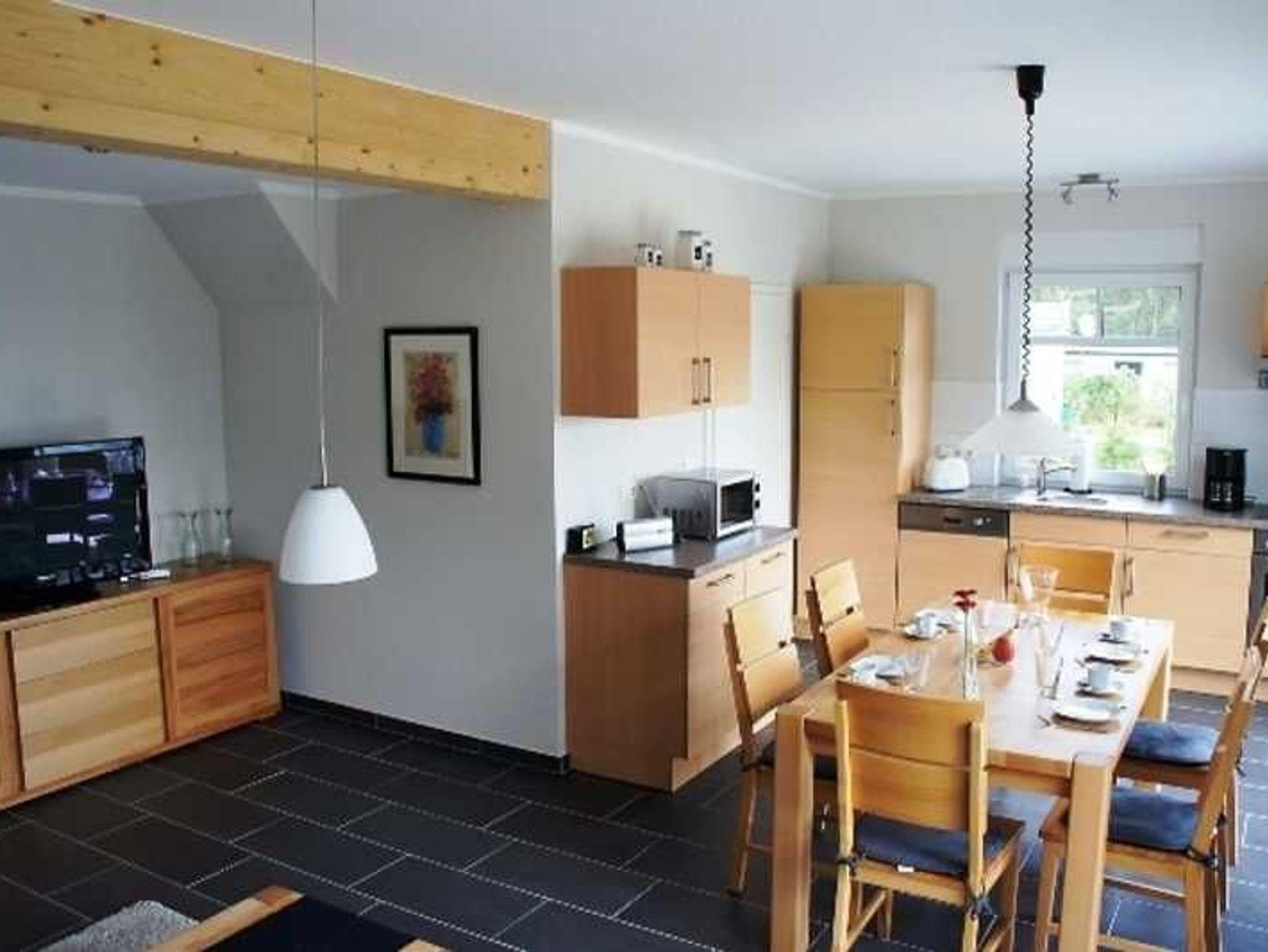 Im Erdgeschoss steht Ihnen 1 Wohn/Esszimmer mit einer SAT-TV Anlage, großem Plasma Flachbildschirm (94cm) und Stereo-Kompakt-Anlage zur Verfügung. Eine offene Küche ( mit E-Herd und Backofen, Kaffeemaschine, Wasserkocher, Mikrowelle, Toaster, großem Kühlschrank/Gefrierfach, Mixer und Geschirrspüler, 1 Kinderhochstuhl) lädt zum gemeinschaftlichen Kochen und Genießen ein. Ebenfalls im Erdgeschoss befinden sich 1 Schlafzimmer (zwei Betten je 2 x1m) , 1 modernes Bad mit bodengleicher Dusche, Waschtisch und WC und Waschmaschine.