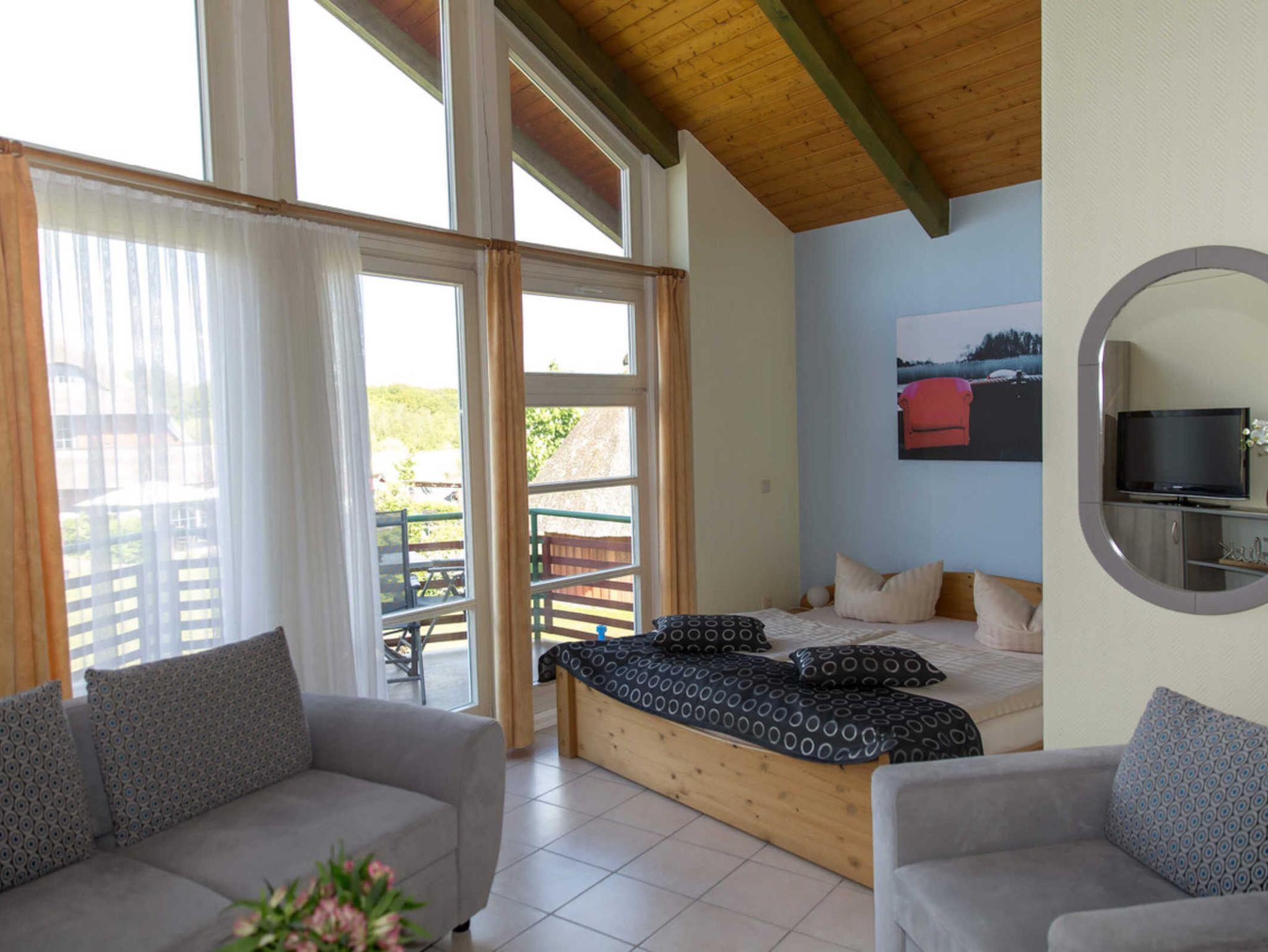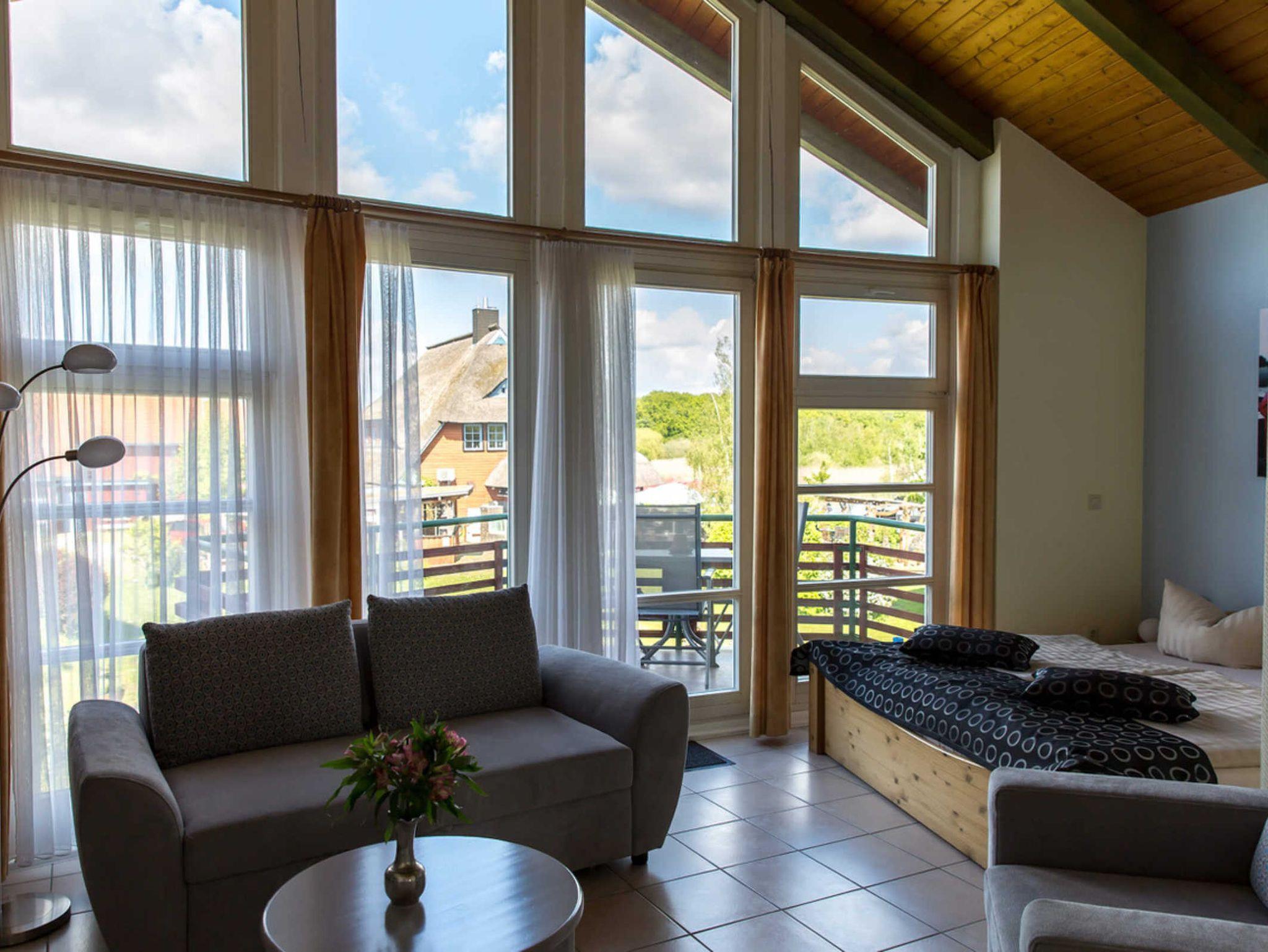 Die Appartementwohnungen befinden sich in architektonisch anspruchsvollen Rundbauten mit raffiniertem Zuschnitt, Sie öffnen sich zum Licht. Einige Appartements besitzen einen Balkon bzw. Terrasse oder Wasserblick. Weitere Annehmlichkeiten sind der Parkplatz direkt vor der Tür, die Sauna und das Solarium im Haus, für kalte Tage die behagliche Fußbodenheizung, der kostenlose Brötchenservice und nicht zu letzt die familiäre Betreuung.