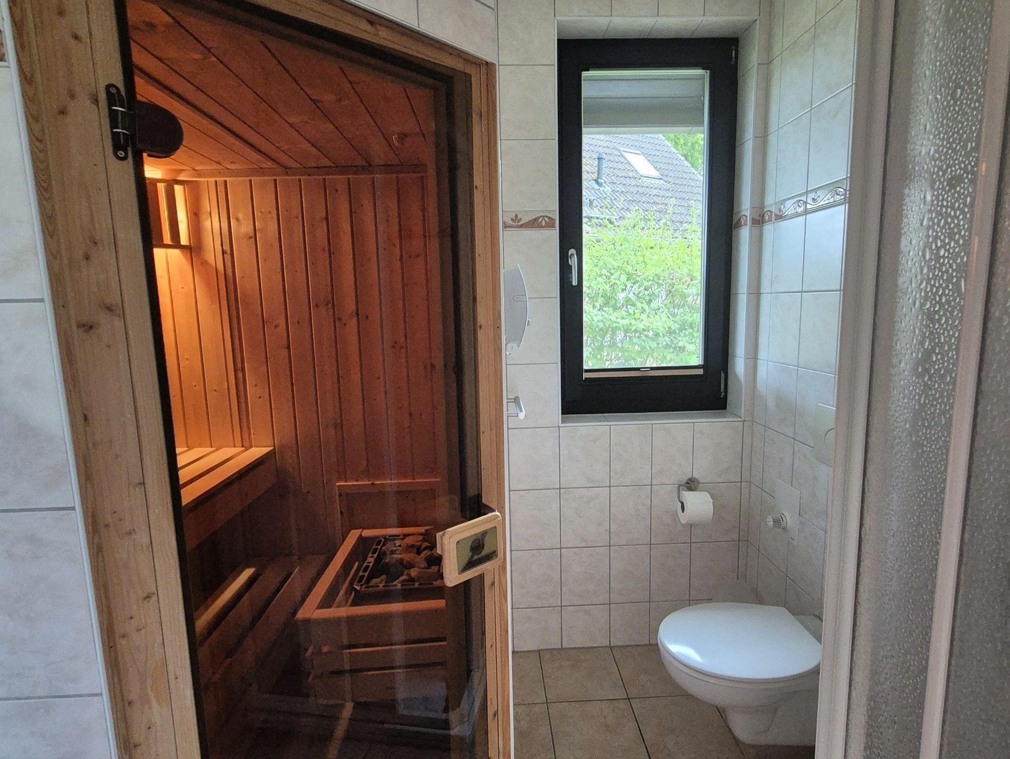 Im EG befindet sich ein Duschbad mit Sauna, ein SZ mit einem Doppelbett und die Küche mit Wohn -und