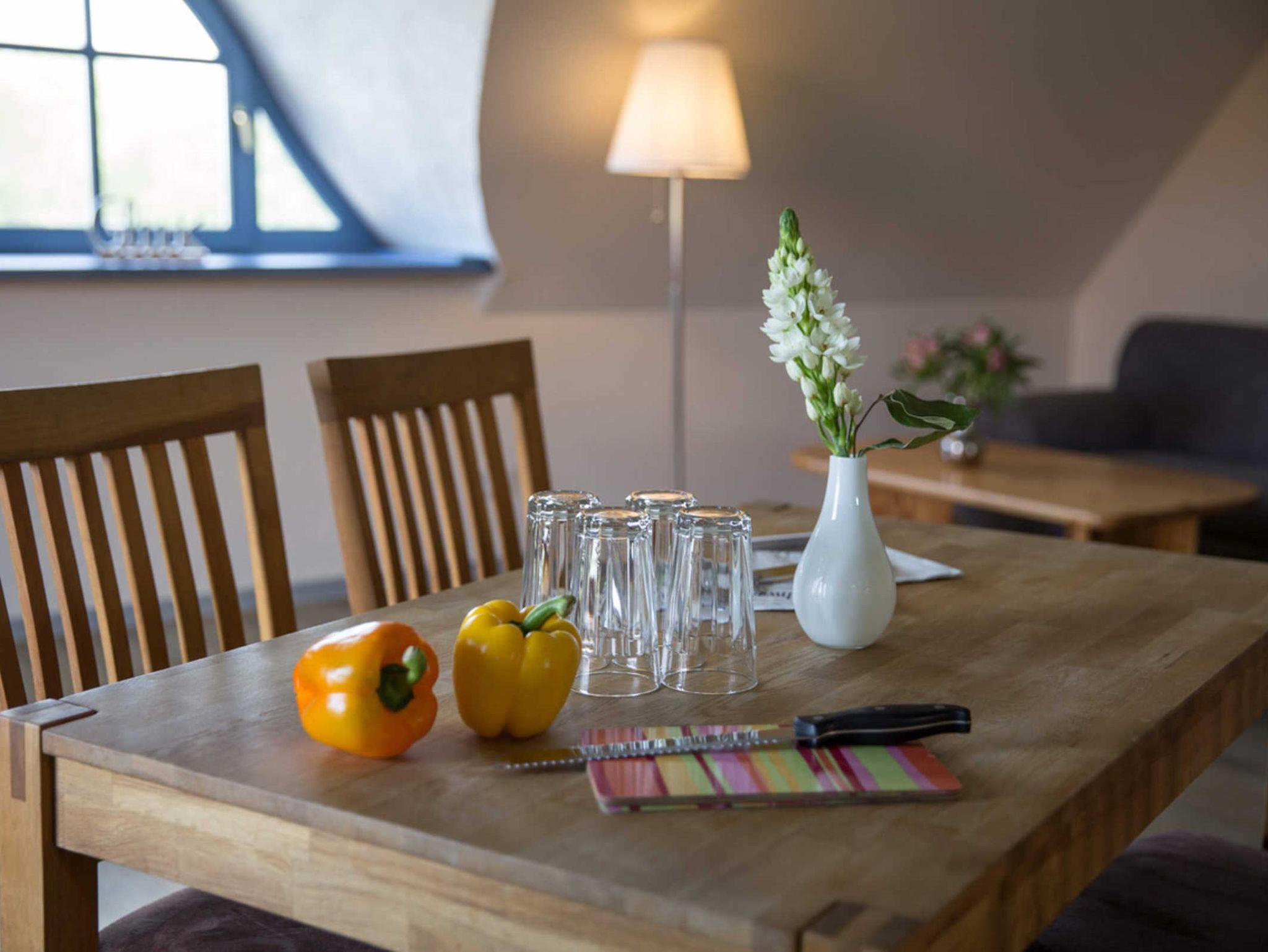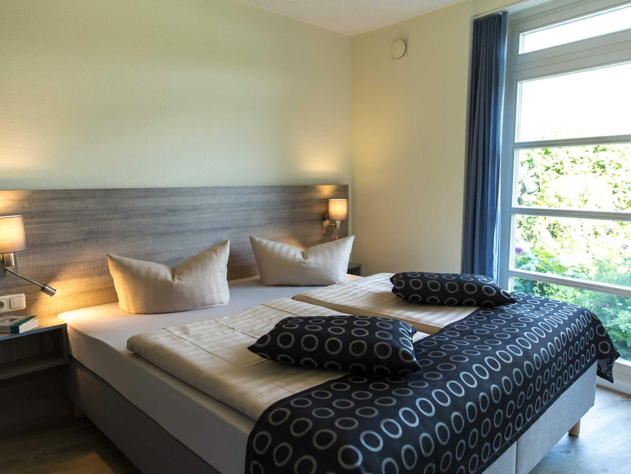 Die Appartementwohnungen befinden sich in architektonisch anspruchsvollen Rundbauten mit raffiniertem Zuschnitt, Sie öffnen sich zum Licht. Einige Appartements besitzen einen Balkon bzw. Terrasse oder Wasserblick. Weitere Annehmlichkeiten sind der Parkplatz direkt vor der Tür, die Sauna und das Solarium im Haus, für kalte Tage die behagliche Fußbodenheizung, der kostenlose Brötchenservice und nicht zu letzt die familiäre Betreuung.