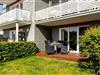 Die Terrasse mit davorliegender Grünfläche ist nach Süden ausgerichtet und mit einem Tisch, vier Stühlen