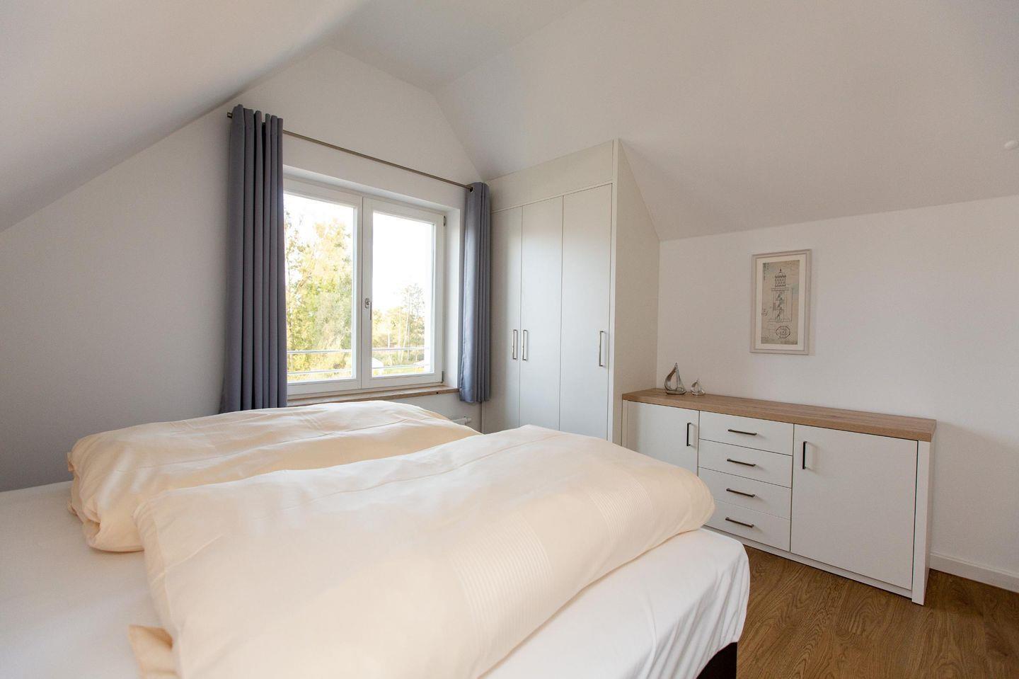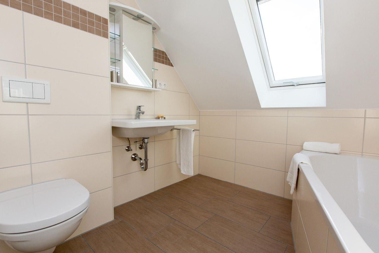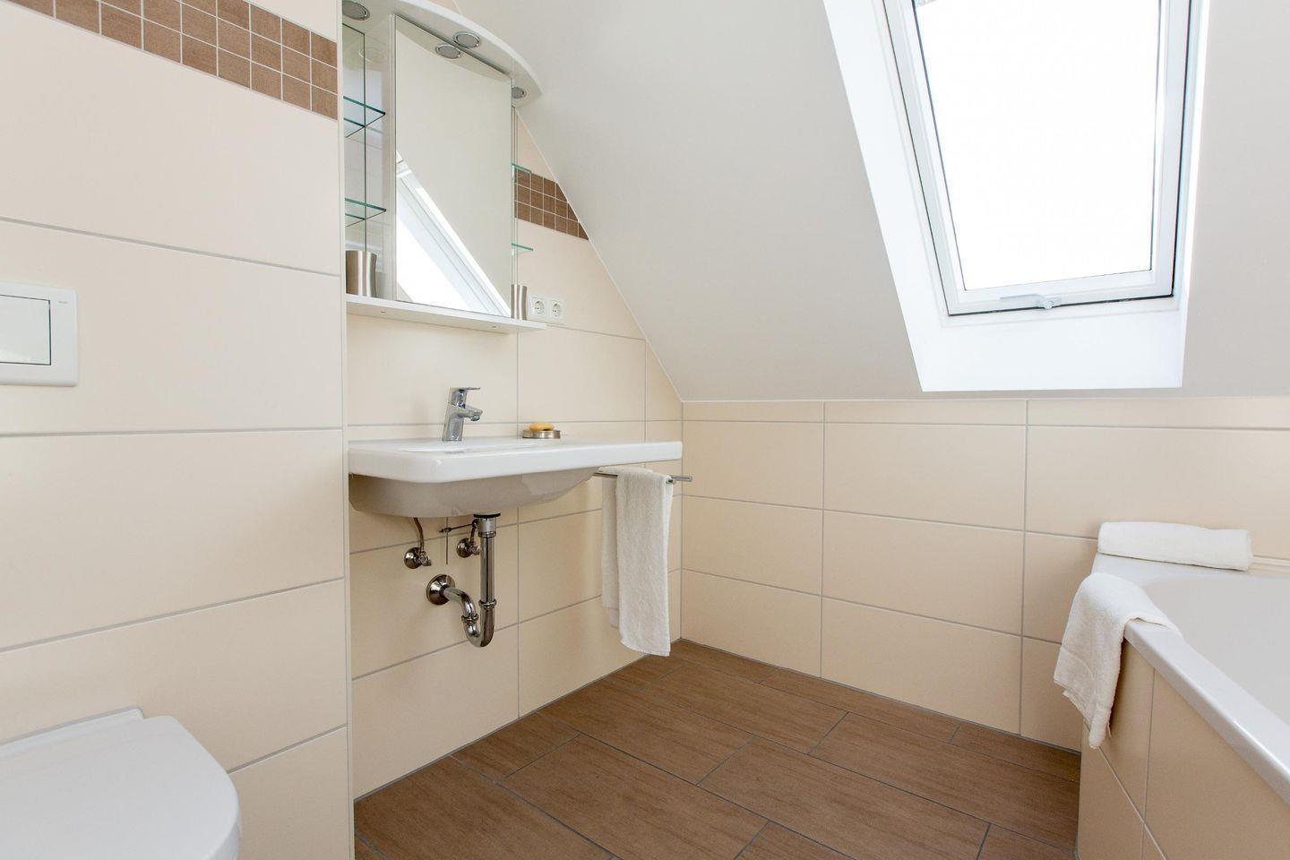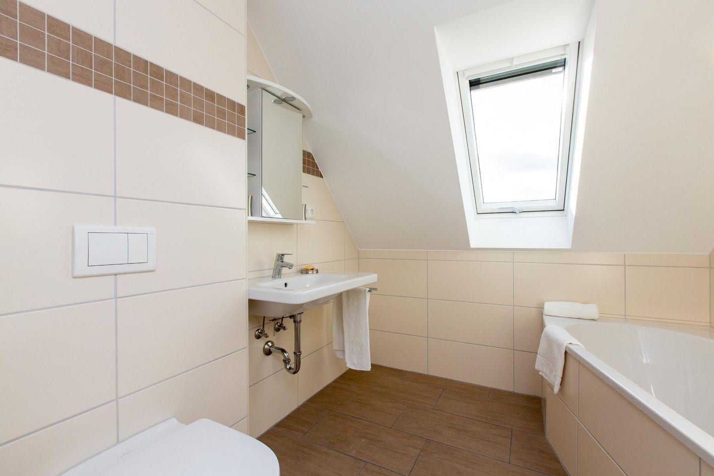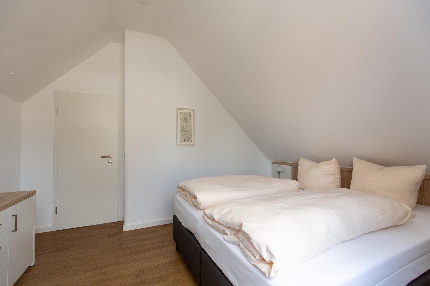 In der zweiten Etage befindet sich das zweite Tageslicht-Bad mit Badewanne, ein weiteres Schlafzimmer mit Boxspringbett (Liegefläche 1,80 m x 2,00 m) und ein Wohnzimmer mit einer Schlafcouch und Zugang zum dritten Balkon.