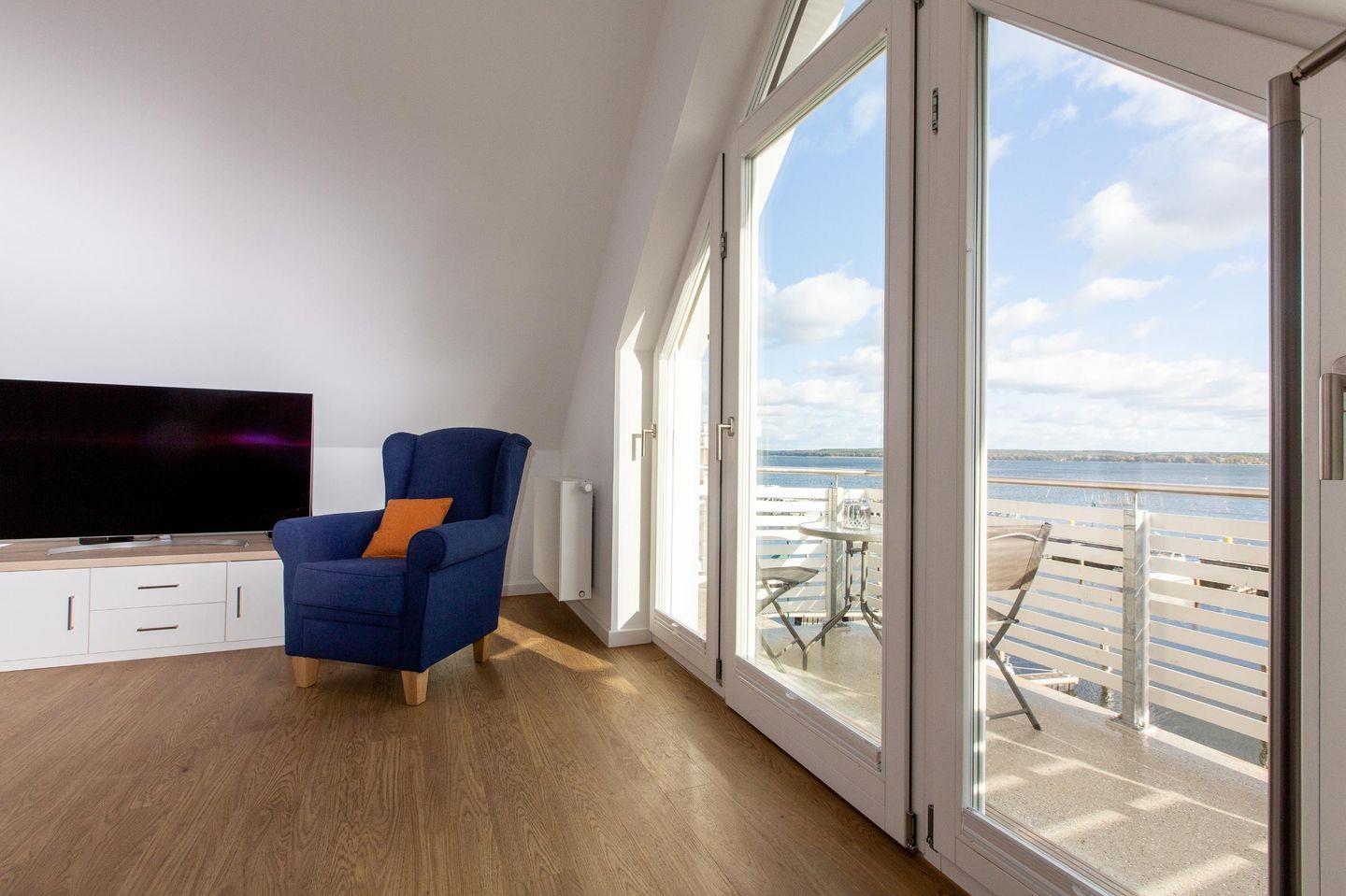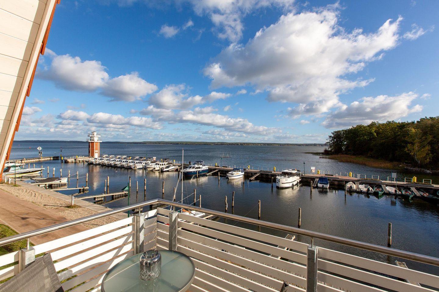 Drei Balkone (Süd-und West-Lage) laden zum Entspannen ein. Vom Westbalkon aus können Sie die imposanten Sonnenuntergänge genießen, von den zwei nach Süden ausgerichteten Balkonen haben Sie einen herrlichen Blick auf den Plauer See, den neuen Hafen, den Aussichtsturm und die Elde-Ausfahrt.