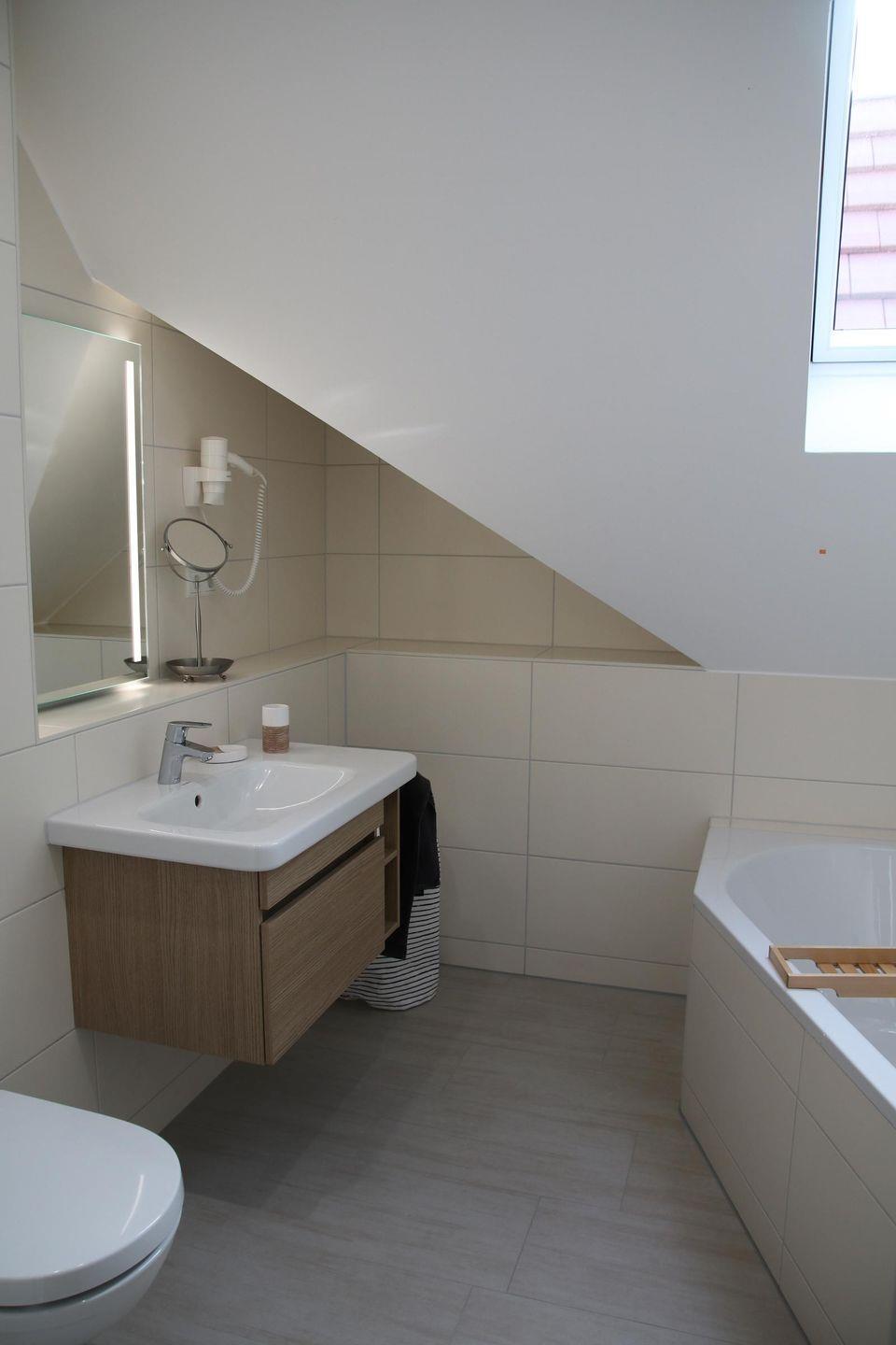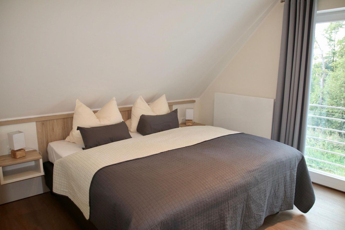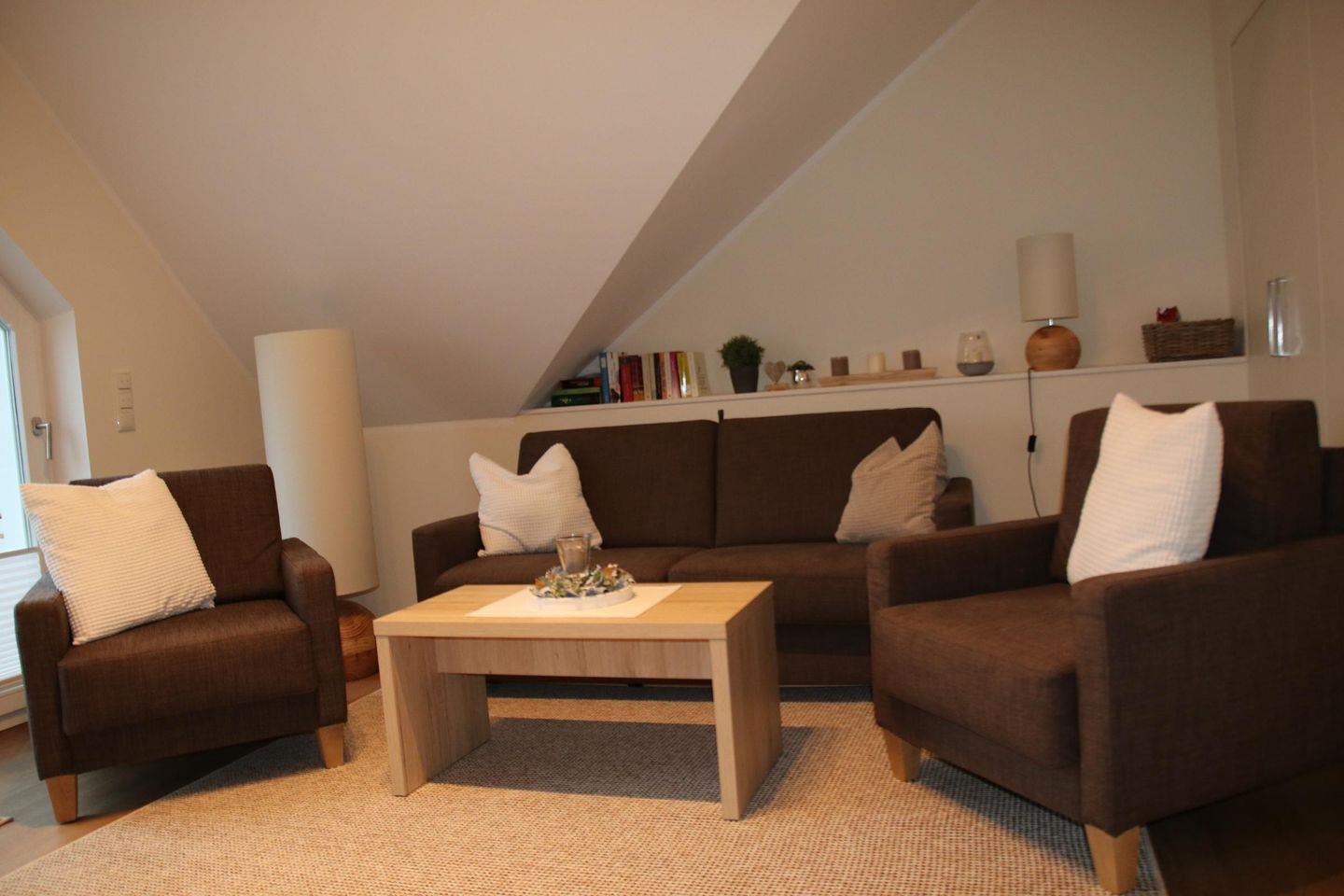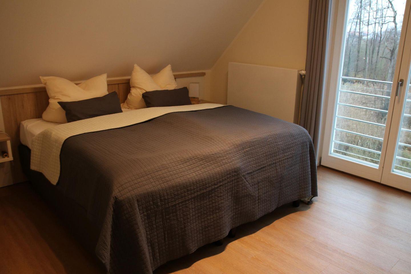 Im Dachgeschoss liegen ein Tageslichtbad mit Badewanne, ein weiteres Schlafzimmer mit einem Boxspringbett (1,80 m x 2,00 m) sowie ein gemütliches Wohnzimmer mit Balkon und Blick auf den See. Der kleine Balkon, ausgestattet mit zwei Relax-Sesseln, ist ebenfalls nach Süden ausgerichtet und läd auf ein ungestörtes Sonnenbad ein.