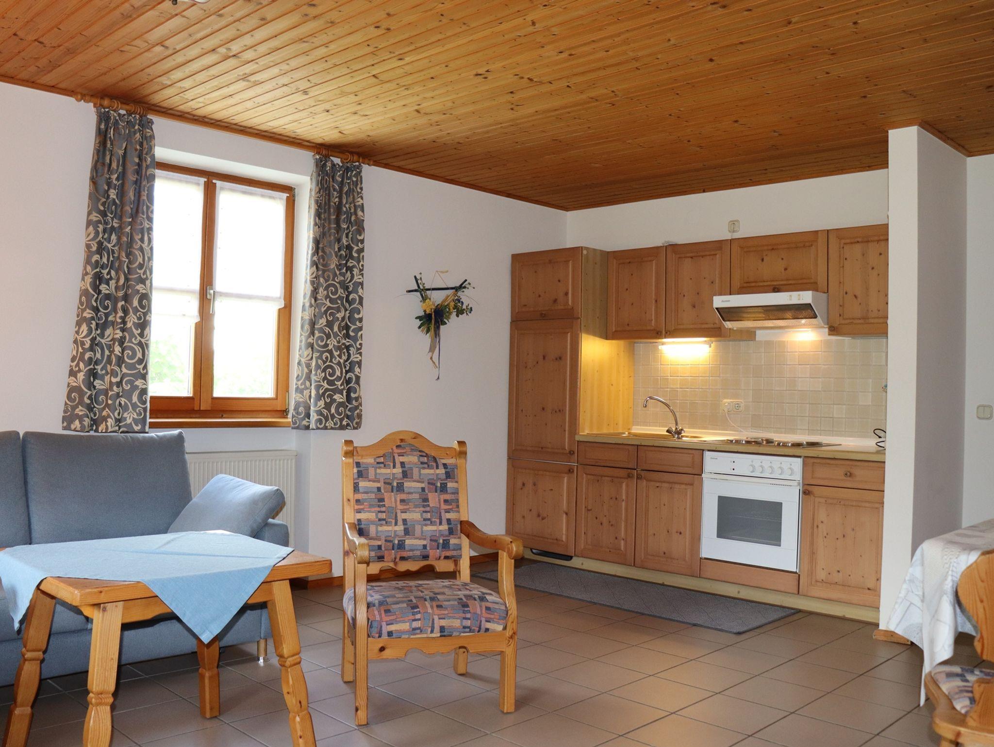 Die Wohnung hat ein Schlafzimmer mit Doppelbett, Badezimmer mit Dusche / WC und Waschbecken, eine Diele und einen Wohnraum mit Küchenzeile, ein Esstisch mit 4 Stühlen, einer kleine Sitzgruppe mit Couch, 2 Sessel und Balkon Südseite. Die Wohnung hat 55 qm und ist im 1. Stock.