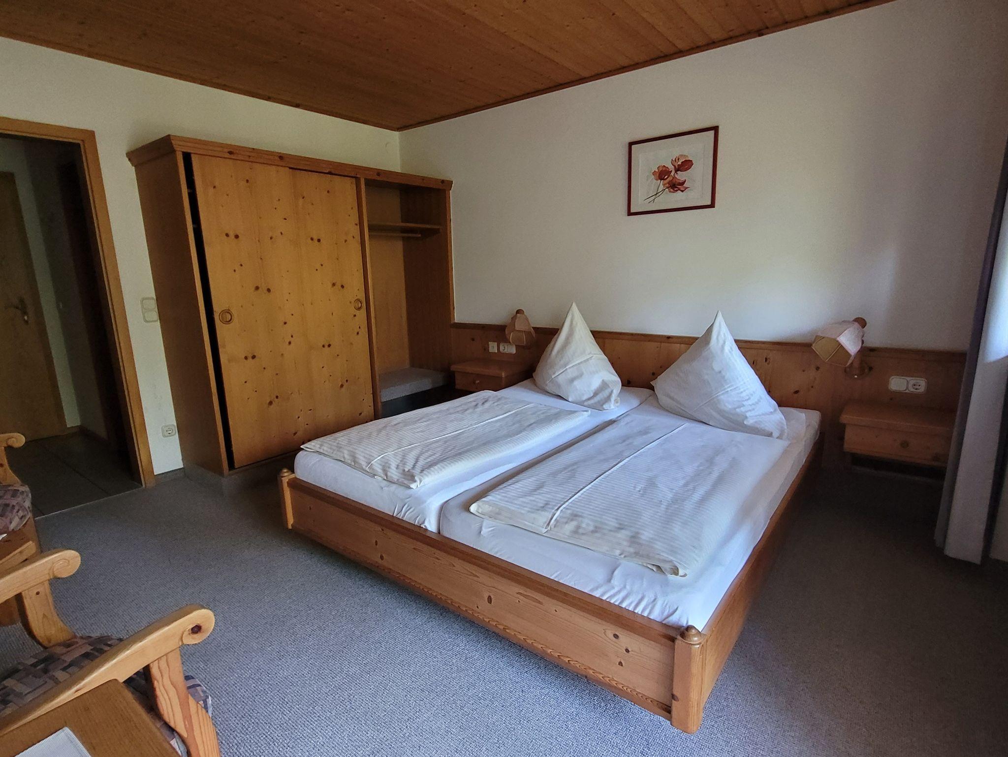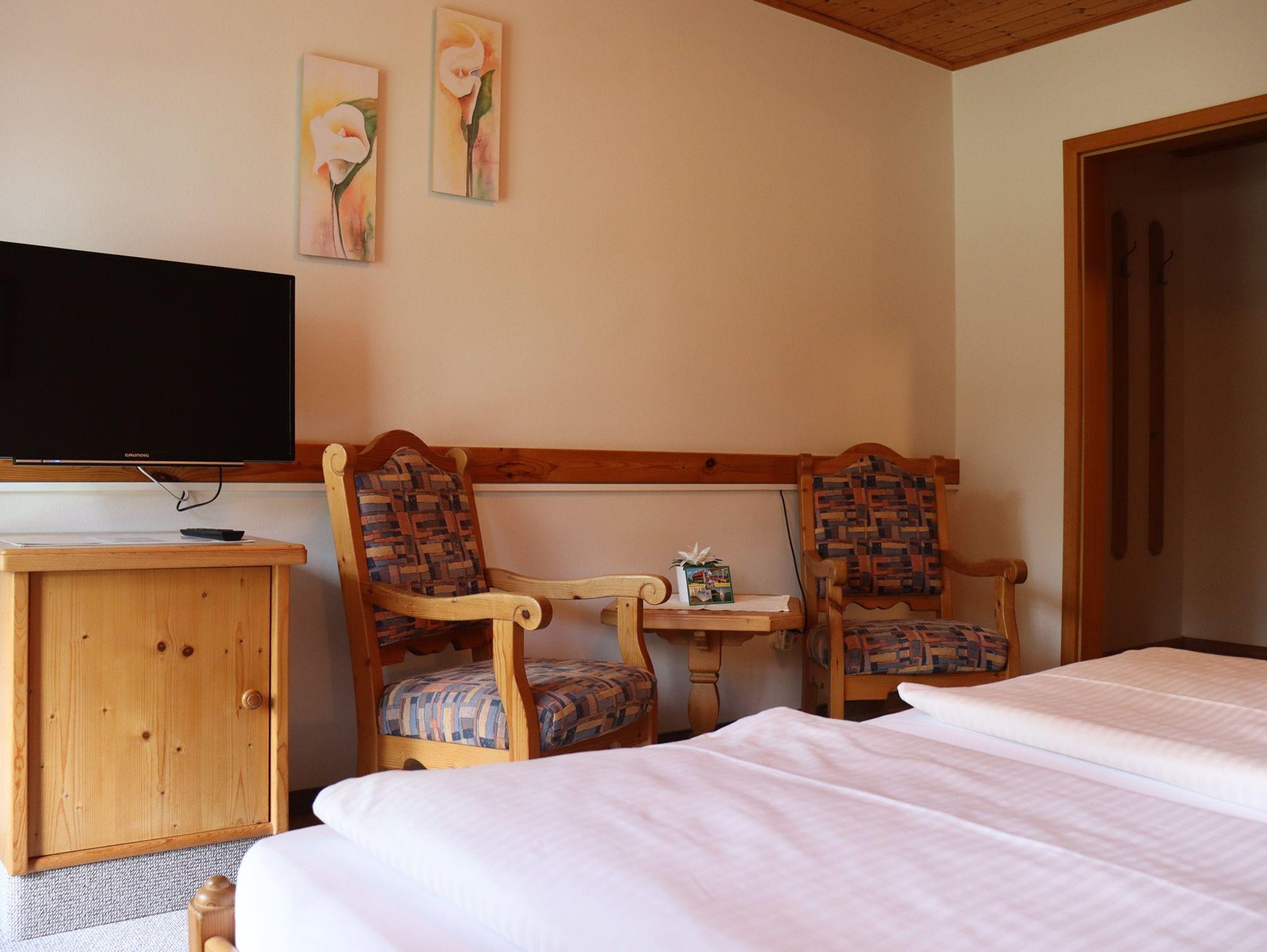 In unseren Doppelzimmer befindet sich ein Doppelbett, Schrank, 2 Sitzgelegenheiten mit Tischchen und ein TV- Gerät. Auf dem Balkon Südseite befindet sich eine Sitzgruppe mit Blick in den Garten.