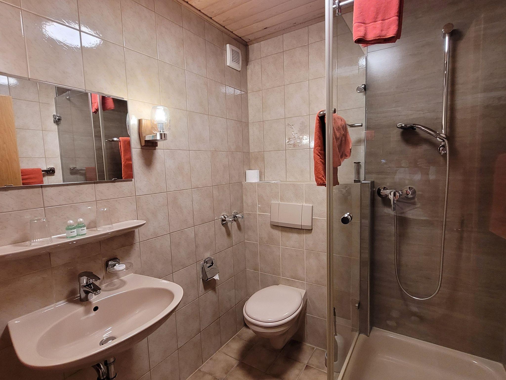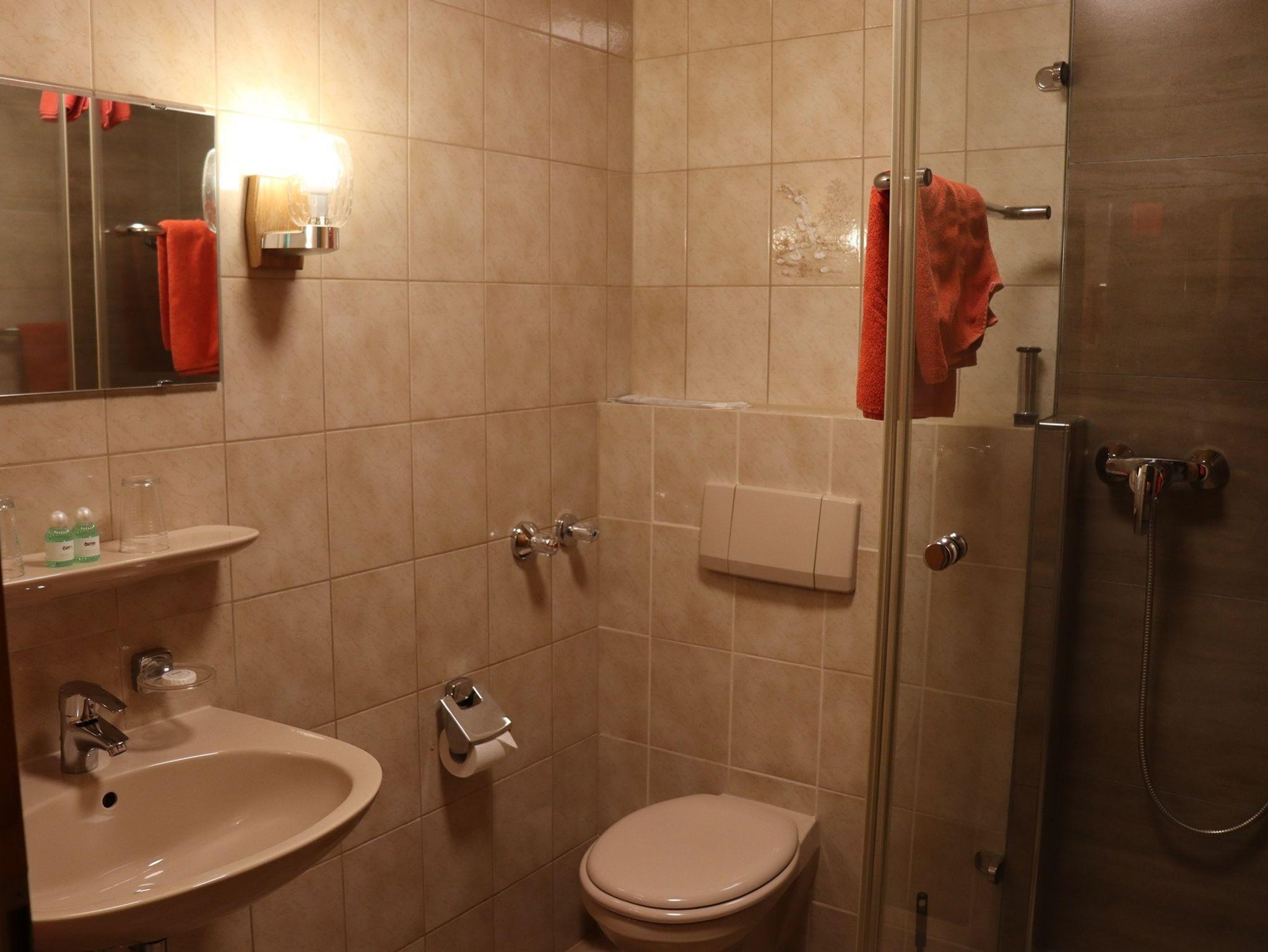Unser Bad besteht aus Dusche, WC und Waschbecken. Einen Fön können sie gerne an der Rezepion verlangen.