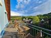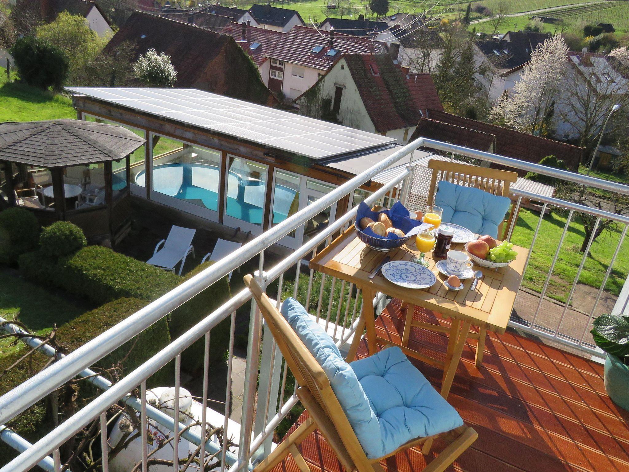Ihr großer Balkon mit Ausblick auf Wald und Weinberge ist mit Gartenmöbel und Sonnenschirm bestückt.
