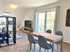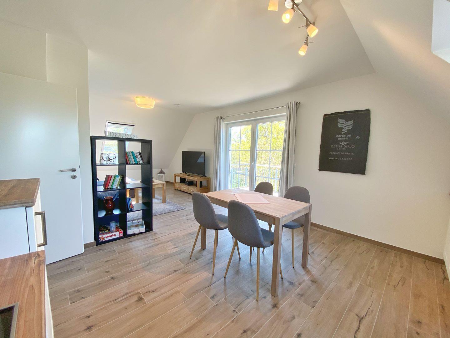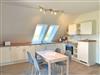 Das Wohn-Esszimmer mit integrierter, offener Küche ist modern und in hellen Farben ausgestattet. Neben einer gemütlichen Couchecke mit Flachbild-TV gibt es einen großen Esstisch. Die Küchenzeile ist ausgestattet mit Geschirrspüler, Ceranfeld, Backofen, Kühlschrank mit Gefriermöglichkeit und natürlich mit Wasserkocher, Kaffeemaschine und Toaster.