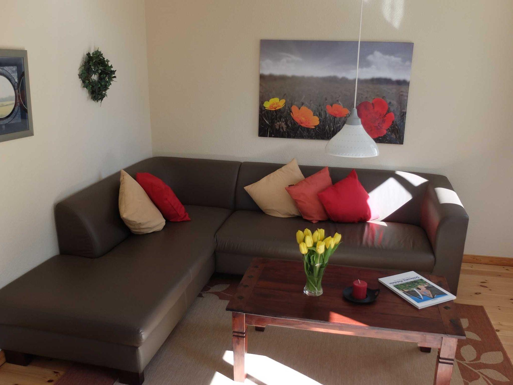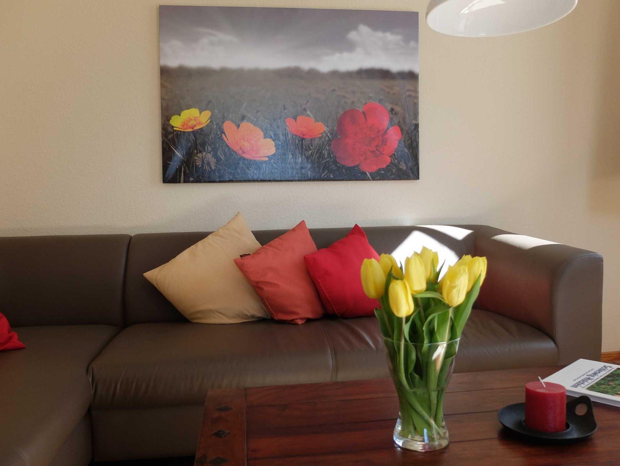 Die Ferienwohnung Schöne Aussicht bietet bis zu 6 Personen angenehmen Urlaubskomfort über zwei Etagen. Moderne Elemente, kräftige Farbakzente und ein weiter Ausblick über Wiesen und Felder sorgen für Wohlfühlambiente.