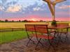 - teilweise überdachte Terrasse mit Sitzmöbeln, Sonnenliege und weitem Blick über Wiesen und Felder.