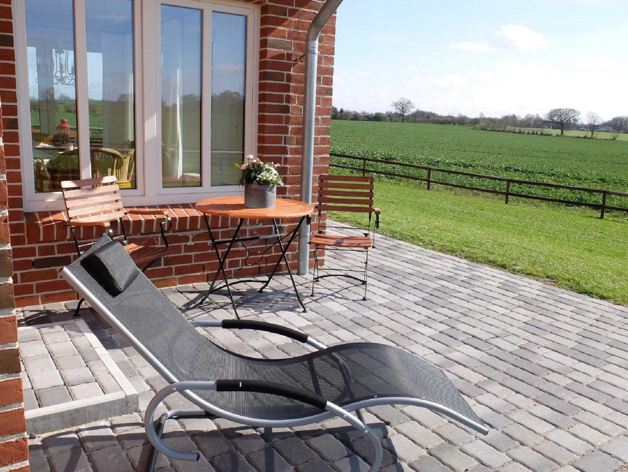 - 2 Terrassen mit Sitzmöbeln, Sonnenliege und weitem Blick über Wiesen und Felder