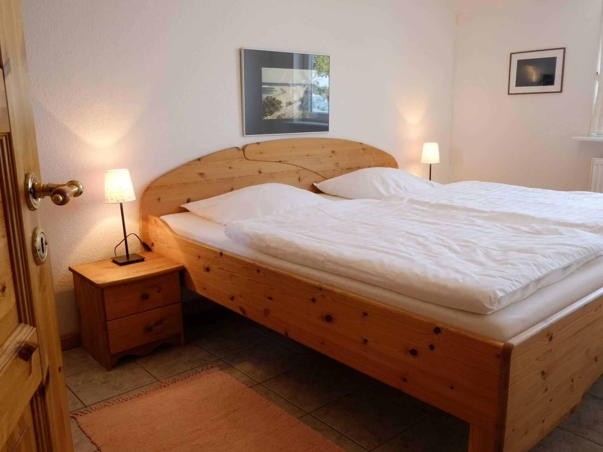 Unsere Ferienwohnung 1 liegt im ersten Stock und ist über eine Außentreppe zu erreichen. Es ist gleich die erste Wohnung am Aufgang. Die Fenster des Wohnraumes blicken nach Süden, die der Schlafzimmer nach Norden, und aus allen Fenstern blickt man auf die Ostsee. Auf der Südseite vor der Wohnung gibt es eine kleine Sitzmöglichkeit auf der Balustrade mit Blick auf die Ostsee. Der Fußboden in allen Zimmern ist gefliest. Die Wohnung verfügt über jeweils zwei Schlafzimmer, eines mit Doppelbett, eines mit zwei Einzelbetten, einen großzügigen Wohnraum und ein Duschbad. Im Wohnraum gibt es eine Fernsehecke mit einem Ecksofa, einen Essplatz für vier Personen, und eine kleine Küchenzeile. Zusätzlich hat die Ferienwohnung 1 noch eine kleine Leseecke.