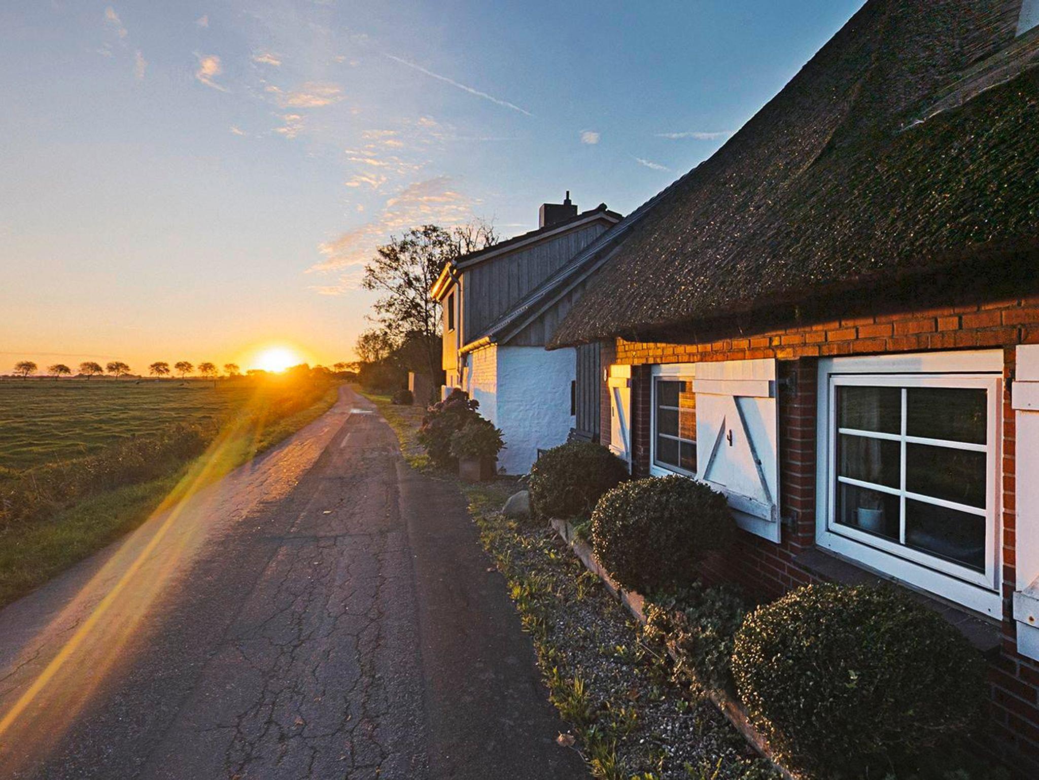 Die geklinkerte Reetdachkate liegt ganz ruhig an einem Wirtschaftsweg und hat einen großen Garten. Nach Norden und Süden gibt es einen phantastischen Blick über die Marsch. Es ist ein gemütliches, komfortables Ferienhaus für 4 Personen mit einem Essbereich in der Küche und einem Esstisch im Wohn-Esszimmer.