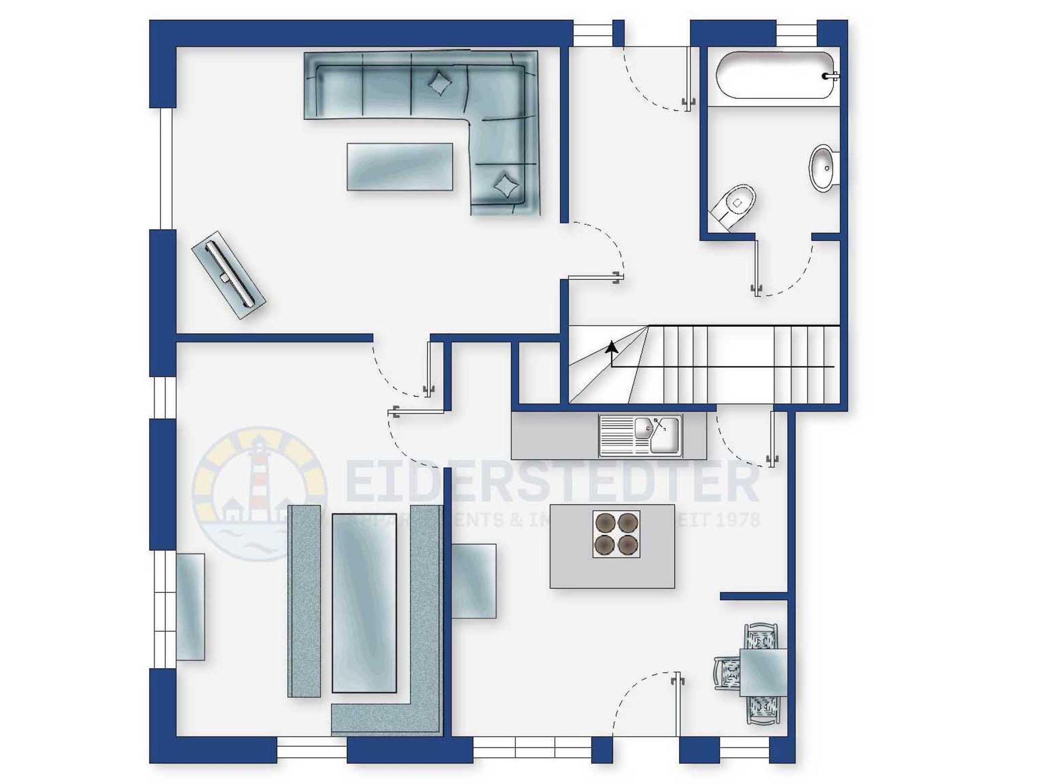 Separate Küche im Eingangsbereich mit allem erdenklichen Komfort (Backofen, Mikrowelle, Geschirrspüler, Kühlschrank mit Gefrierfach), Arbeitsinsel mit zwei Barhockern und einem Tisch mit 3 Stühlen. In der Küche befindet sich eine Waschmaschine. Von der Küche haben Sie direkten Zugang zur möblierten Gartenterrasse nach Osten mit Blick über die Marschwiesen.