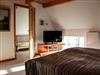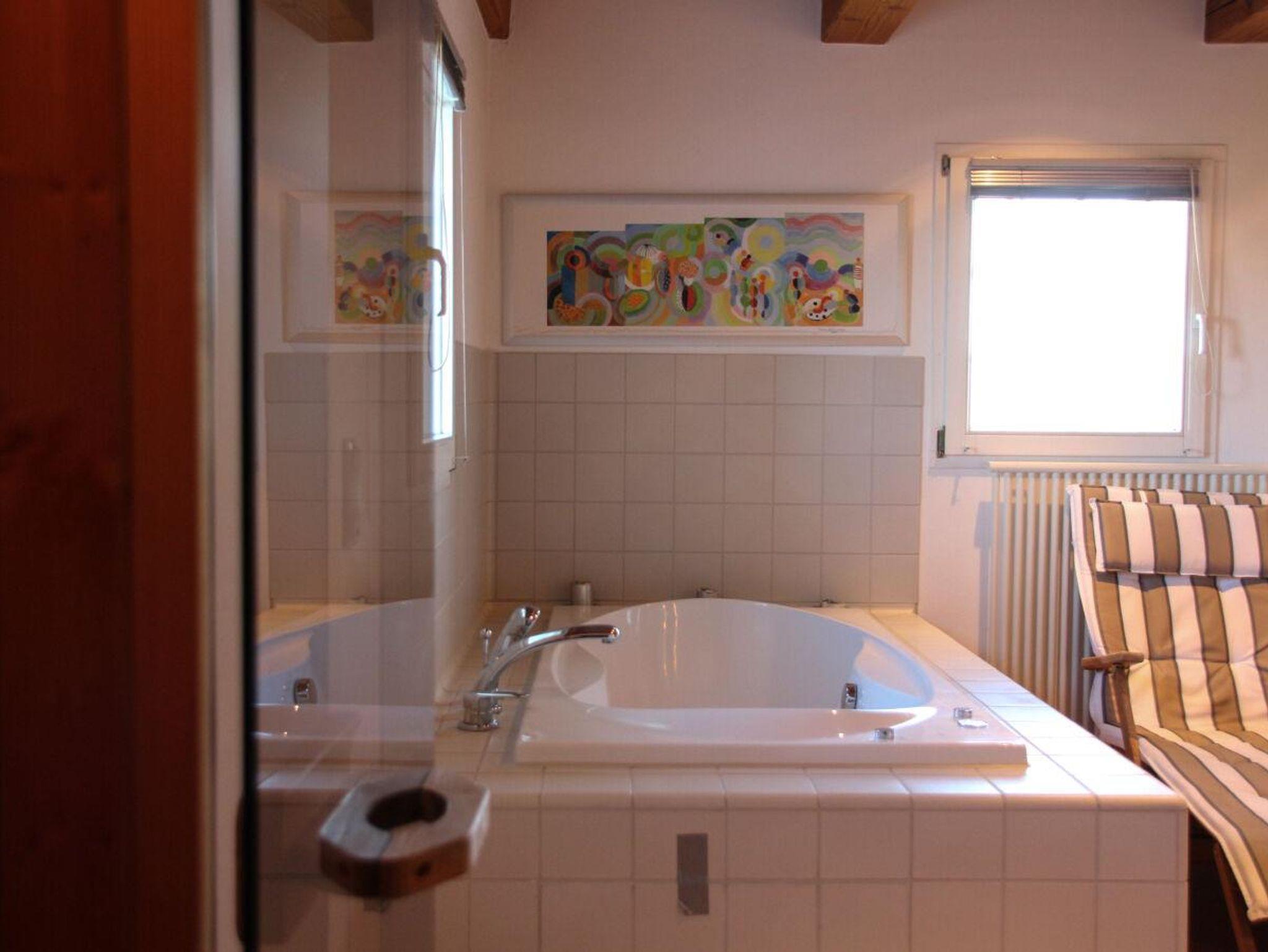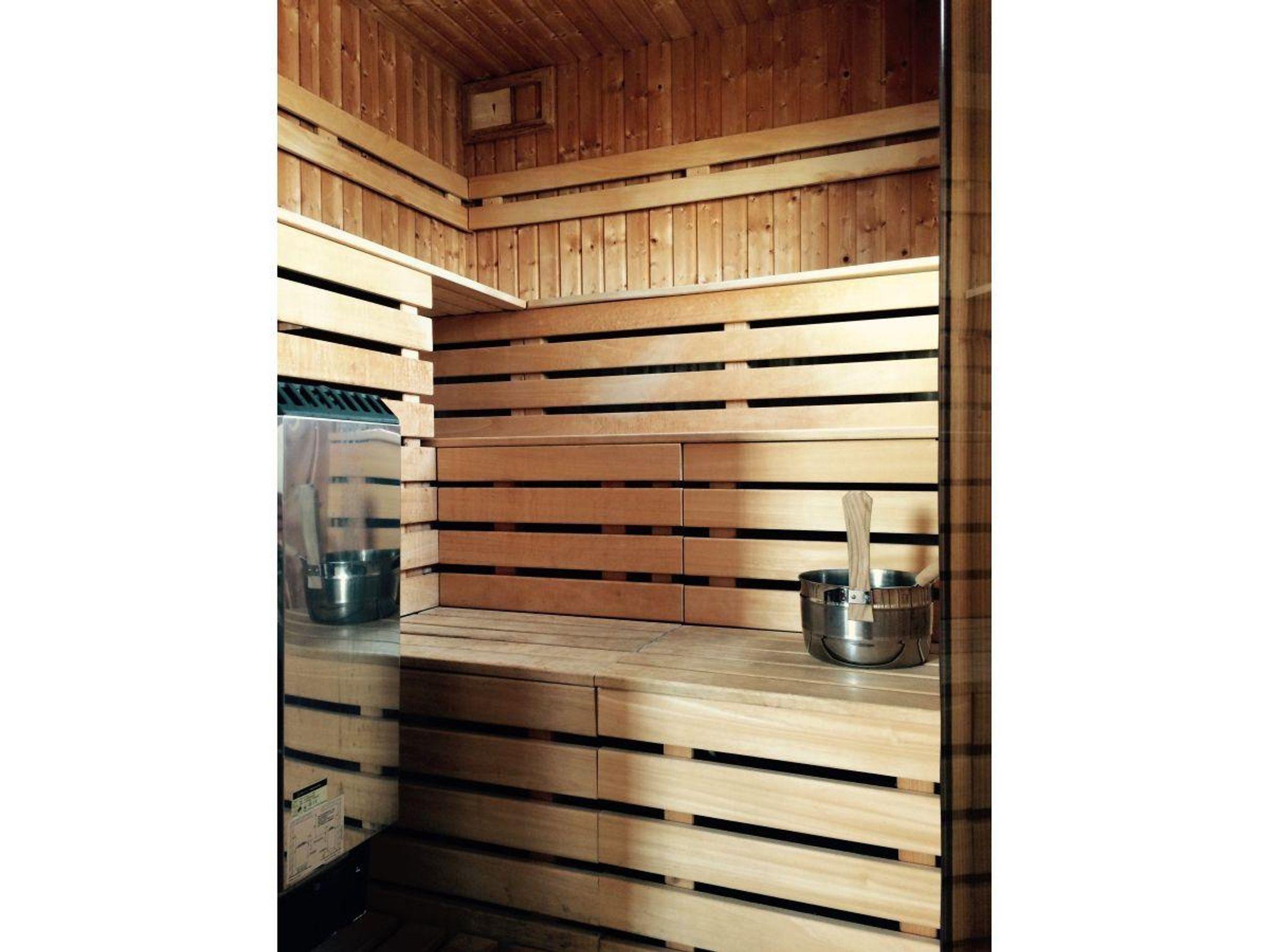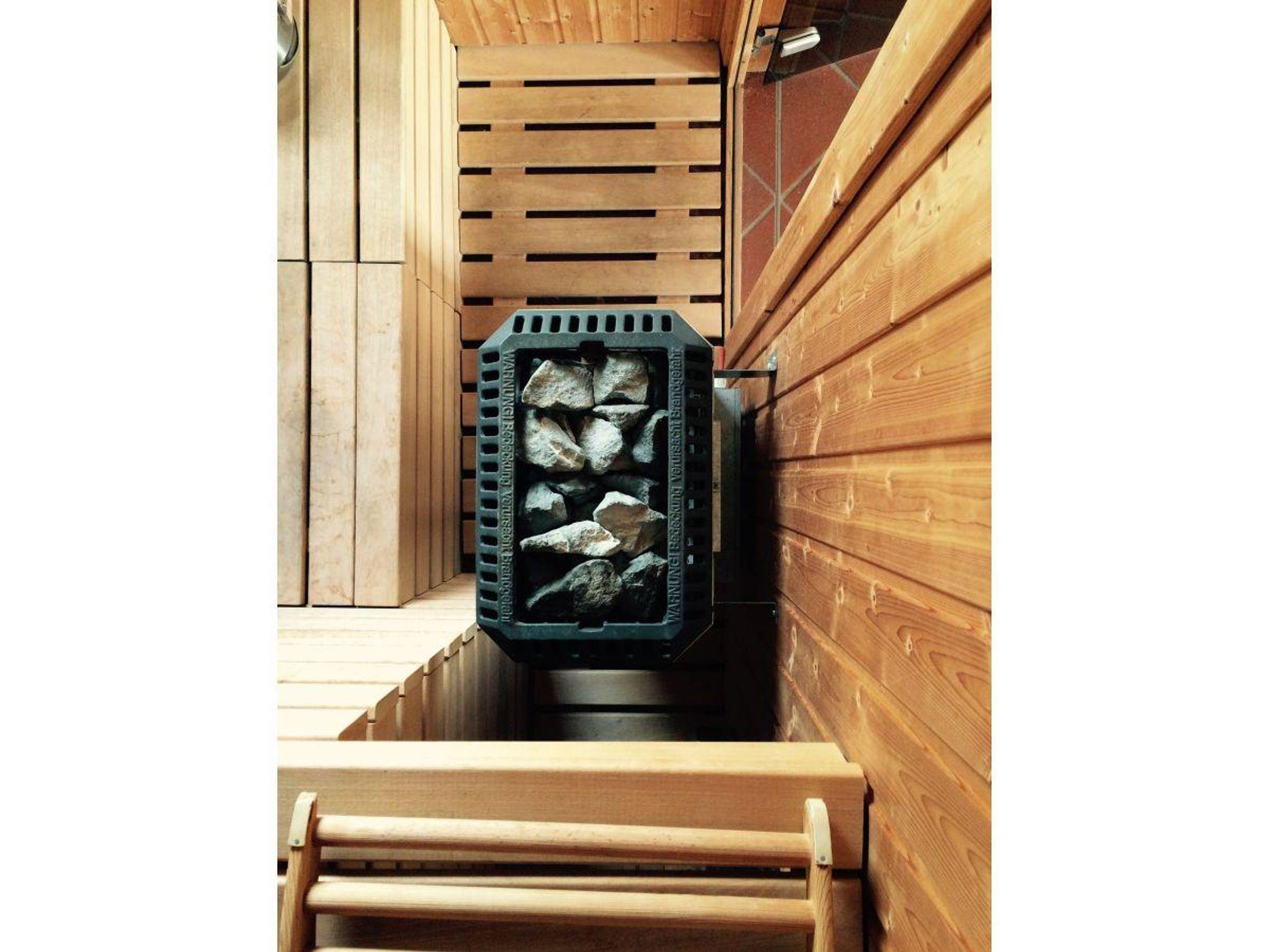 Der Wellnessbereich mit integrierter Fussbodenheizung ist mit einer traditionellen Sauna, Whirlpool, Kaltwasserdusche und Fitnessgeräten ausgestattet.