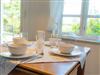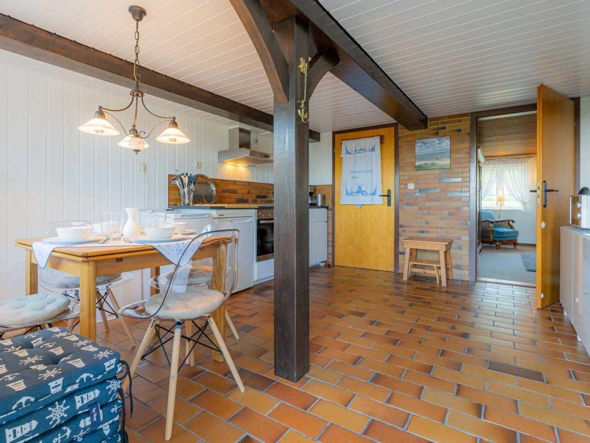 Separate Küche im Eingangsbereich mit Backofen, Mikrowelle, Kühlschrank mit Gefrierfach, Waschmaschine (TopLoader) und Esstisch mit 4 Stühlen. Haushaltsschrank mit Staubsauger. Direkter Zugang zur möblierten Gartenterrasse nach Osten mit Blick über die Marschwiesen.