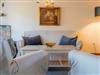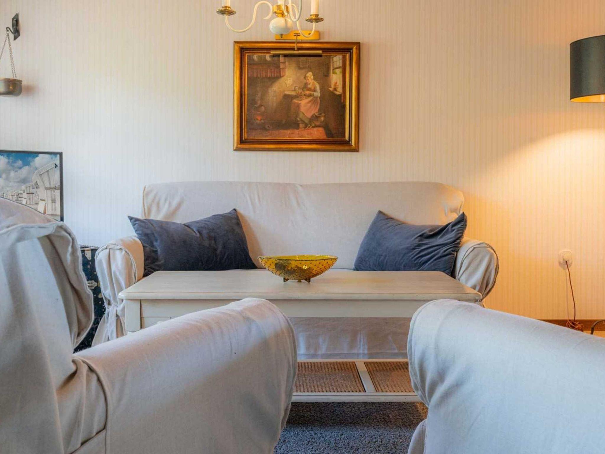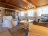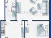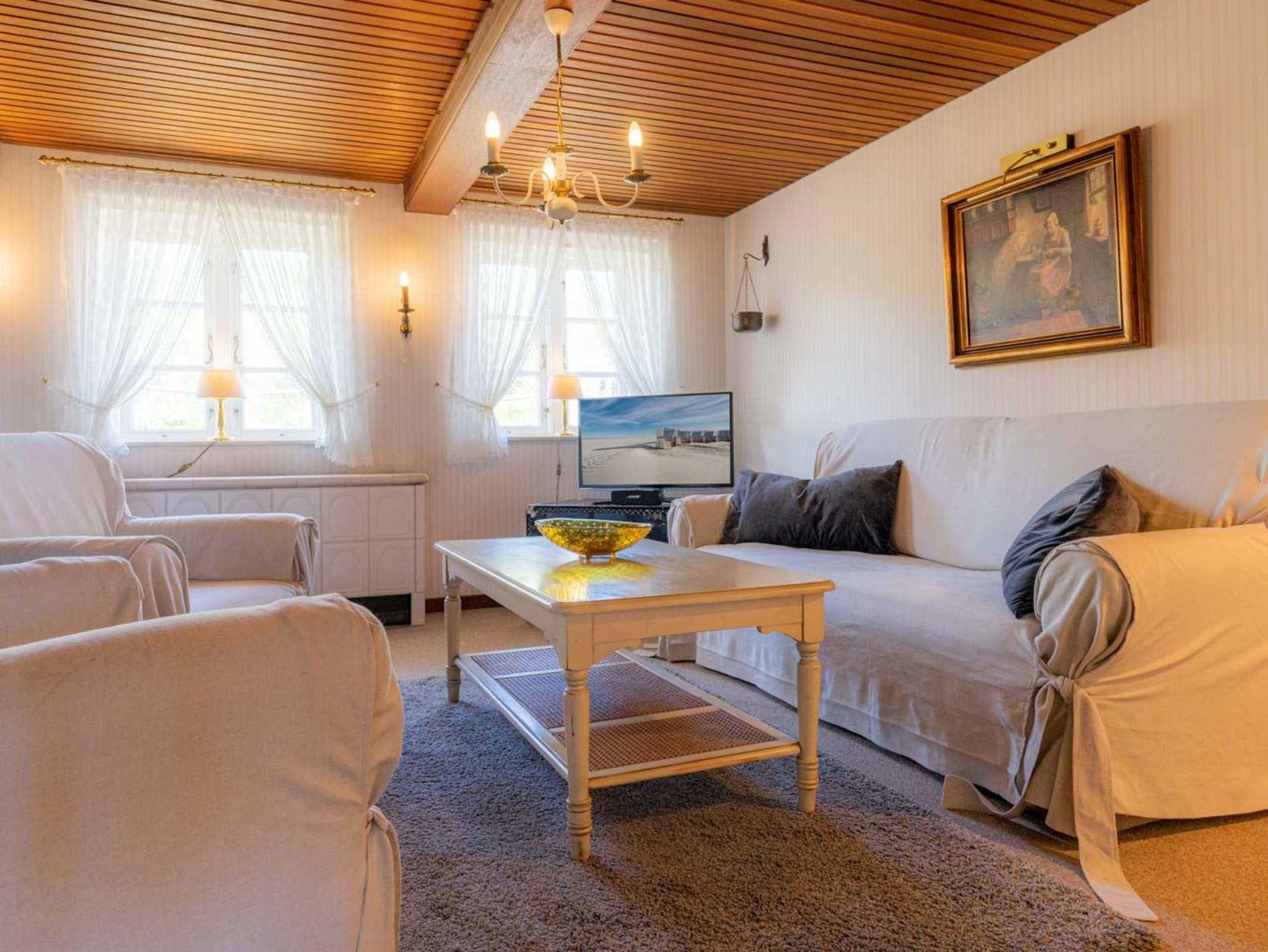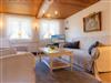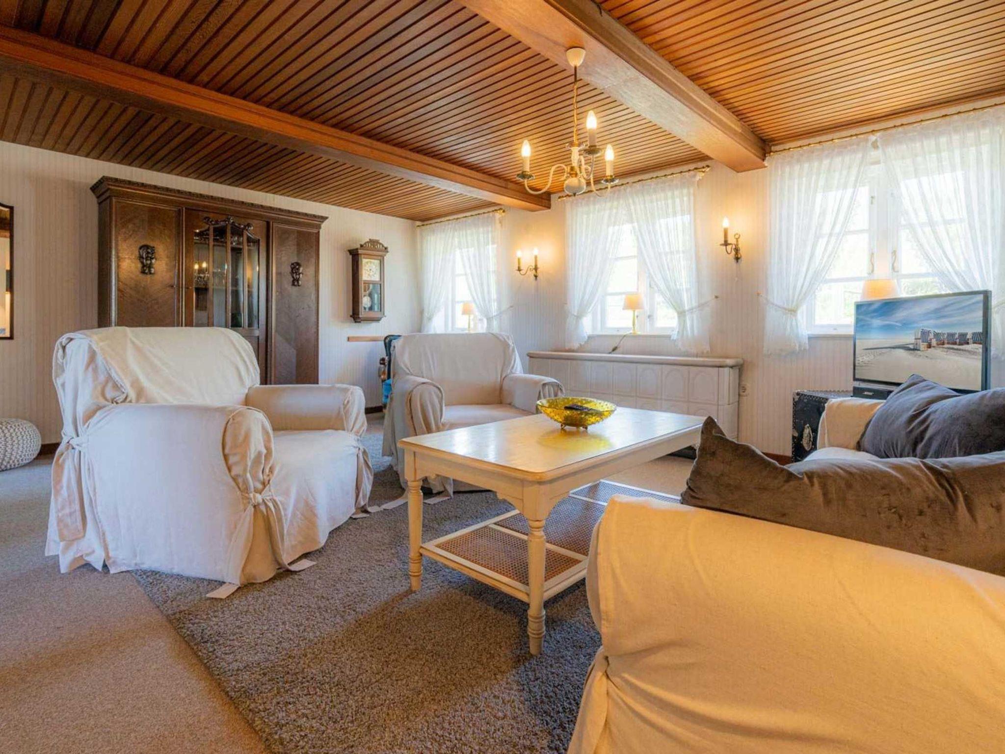 Wohnzimmer mit Sofa, 2 Sesseln, TV (Sat) mit BluRay-Player und Bluetooth-Soundsystem.