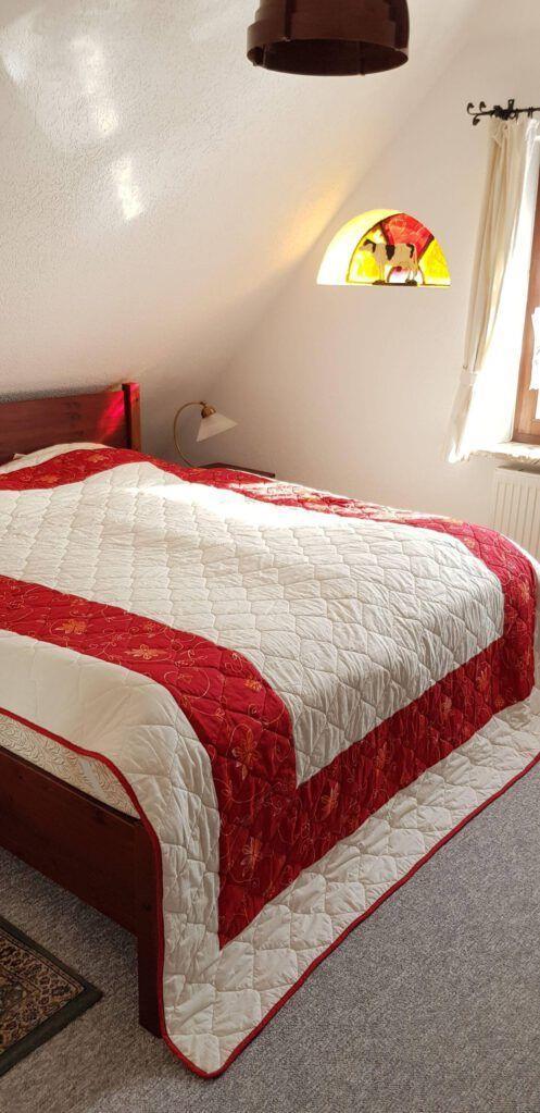 Schlafzimmer mit Doppelbett und Kleiderschrank.
