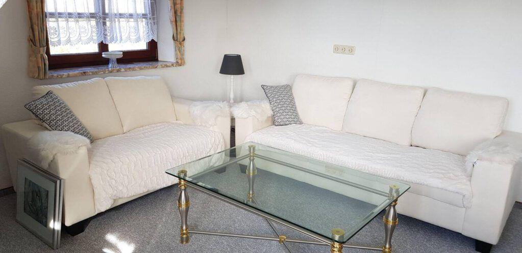 Wohn-Essraum mit Sat-TV, Couchgarnitur, Essbereich für 2 Personen.