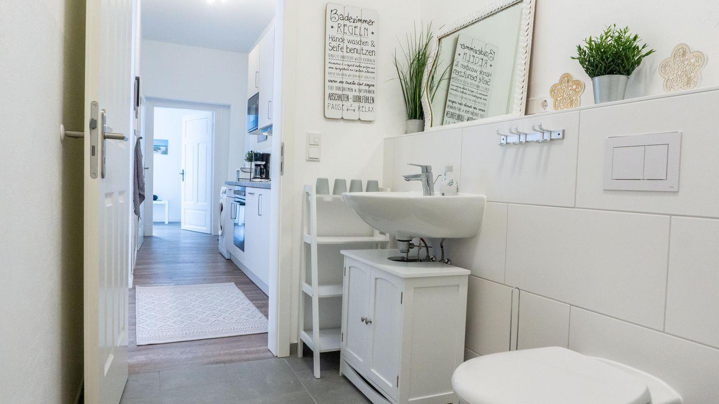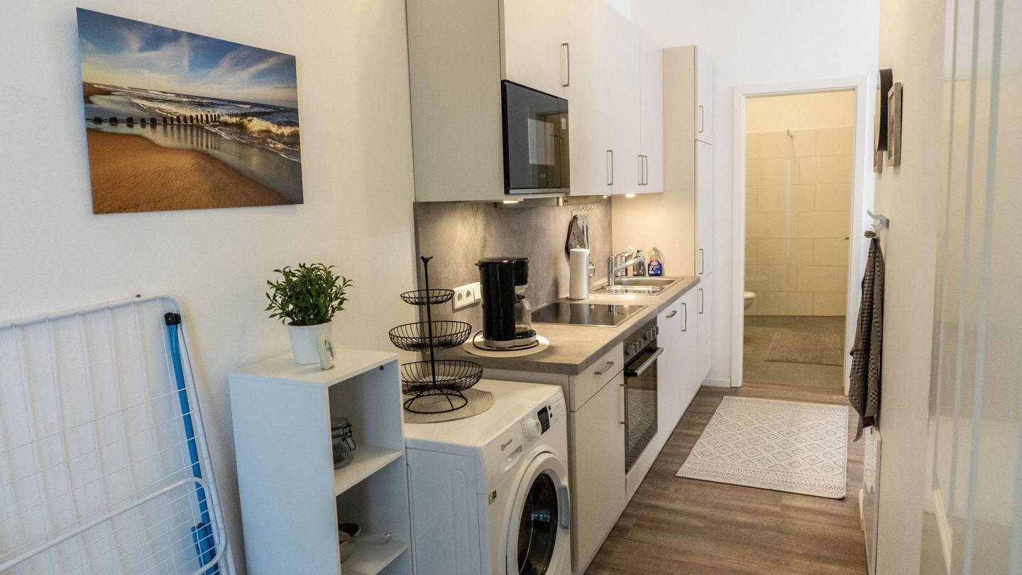 Waschmaschine (Eigennutzung), Trockner (gemeinschaftlich) und Wäscheständer bieten zusätzlichen Komfort für längere Aufenthalte.