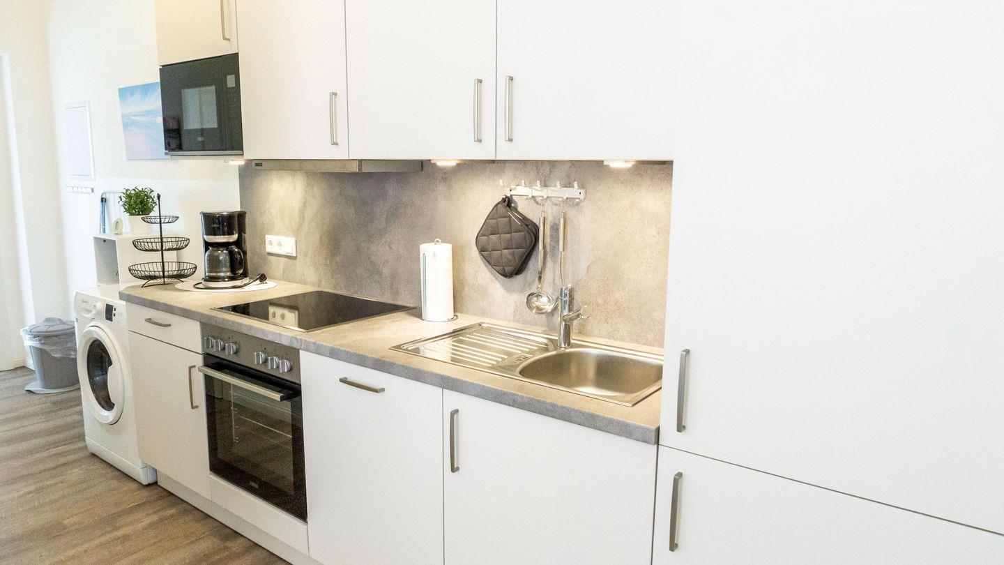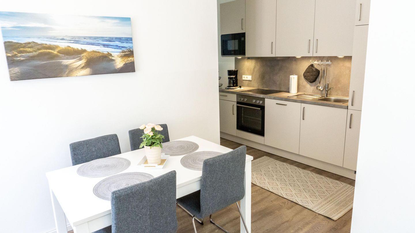 Das offene Wohnkonzept verbindet die vollständig ausgestattete Küche mit dem Wohn- und Essbereich. Hier finden Sie einen großzügigen Essplatz, eine Sofaecke und einen modernen Sat-TV (44 - 55 Zoll) mit internationalen Kanälen – ideal für gemeinsame Abende. Die Küche lässt keine Wünsche offen: Ceranherd, Backofen, Mikrowelle, Kühlschrank mit Gefrierfach, Spülmaschine, Kaffeemaschine, Wasserkocher, Toaster, Sandwich-Toaster sowie umfangreiche Küchenutensilien stehen zur Verfügung. Selbst an Details wie Geschirrhandtücher und Gewürze wurde gedacht. Ein Brötchenservice ist für einen entspannten Start in den Tag verfügbar.