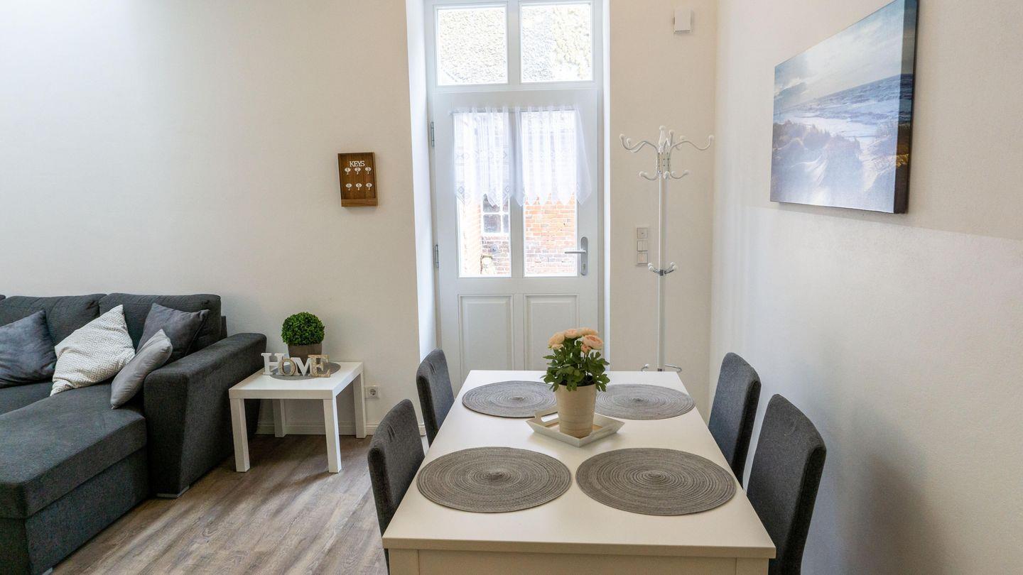Auf 60 m² Wohnfläche bietet die Ferienwohnung komfortabel Platz für bis zu fünf Personen. Zwei Schlafzimmer mit einem Doppelbett (200x180cm) und ein Etagenbett für 2 ( 200x90) sowie ein Schlafsofa im Wohnbereich für eine Person bieten flexible Schlafmöglichkeiten, sodass sowohl Familien mit Kindern, Babys und Jugendlichen als auch Paare oder kleinere Gruppen den Aufenthalt genießen können. Die Parterrewohnung ist über einen privaten Eingang erreichbar und verfügt über Sichtschutz an allen Fenstern, was für Privatsphäre sorgt. Die Fußbodenheizung, moderne Vinylböden im Wohnzimmer und eine angenehme Raumaufteilung schaffen ein wohnliches und gemütliches Ambiente, in dem Sie sich zu jeder Jahreszeit wohlfühlen können.