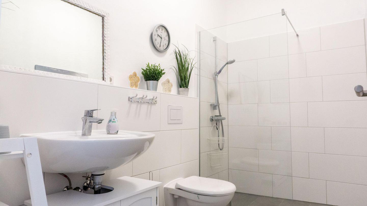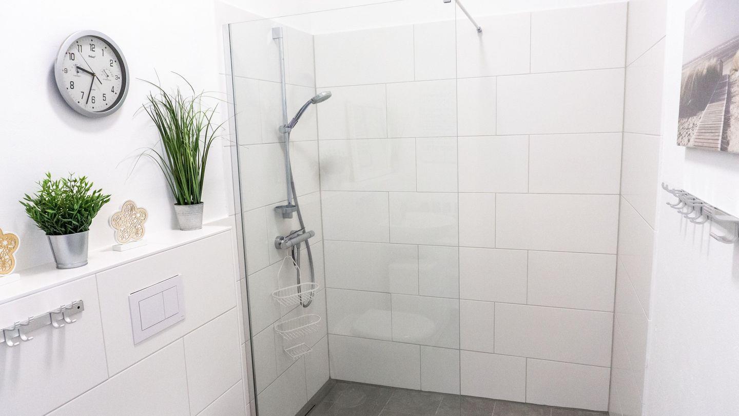 Das Bad ist mit einer bodentiefen Dusche, Handtüchern, Badetüchern, Haartrockner, Waschbecken und Spiegel hochwertig ausgestattet.
