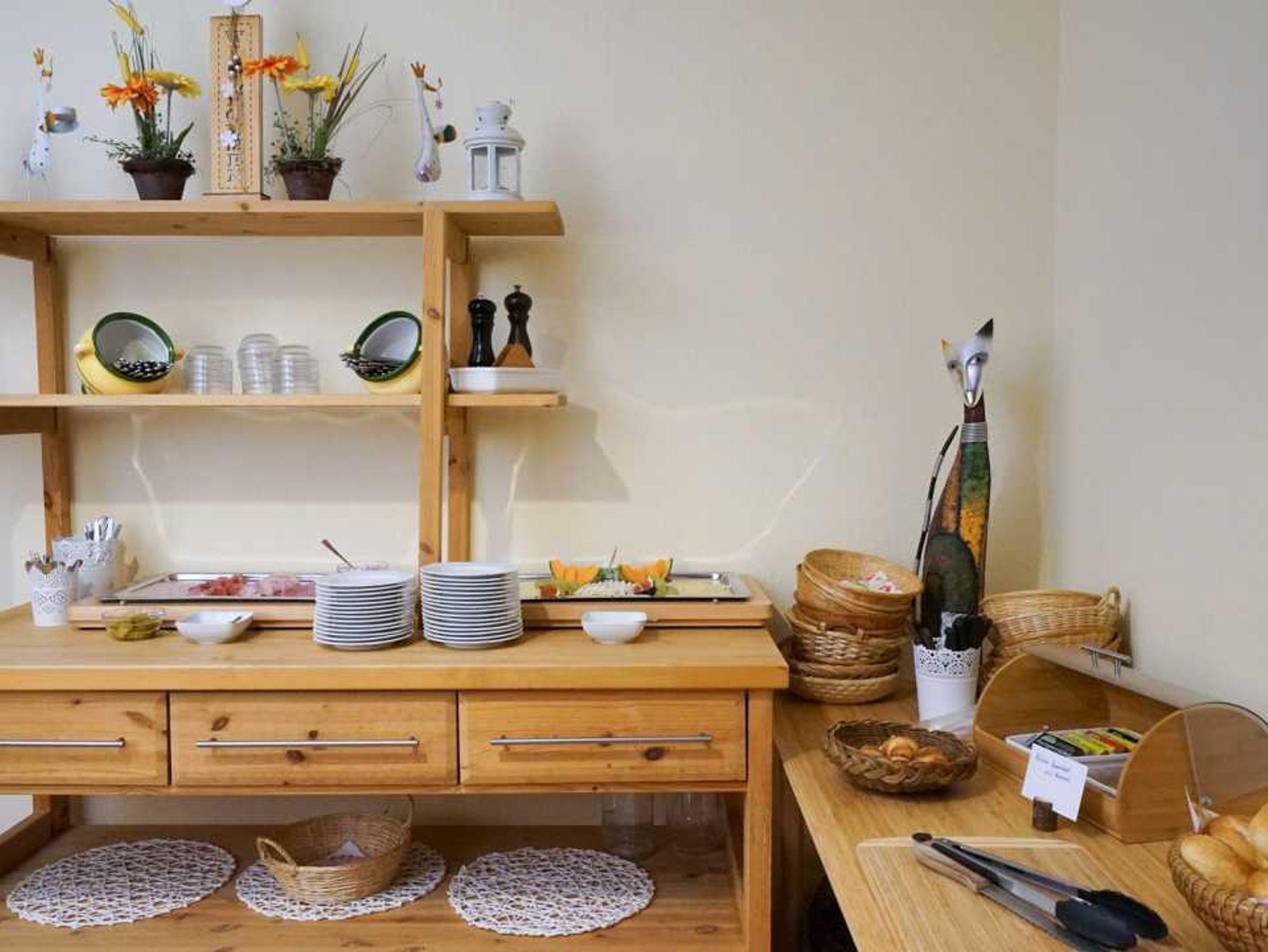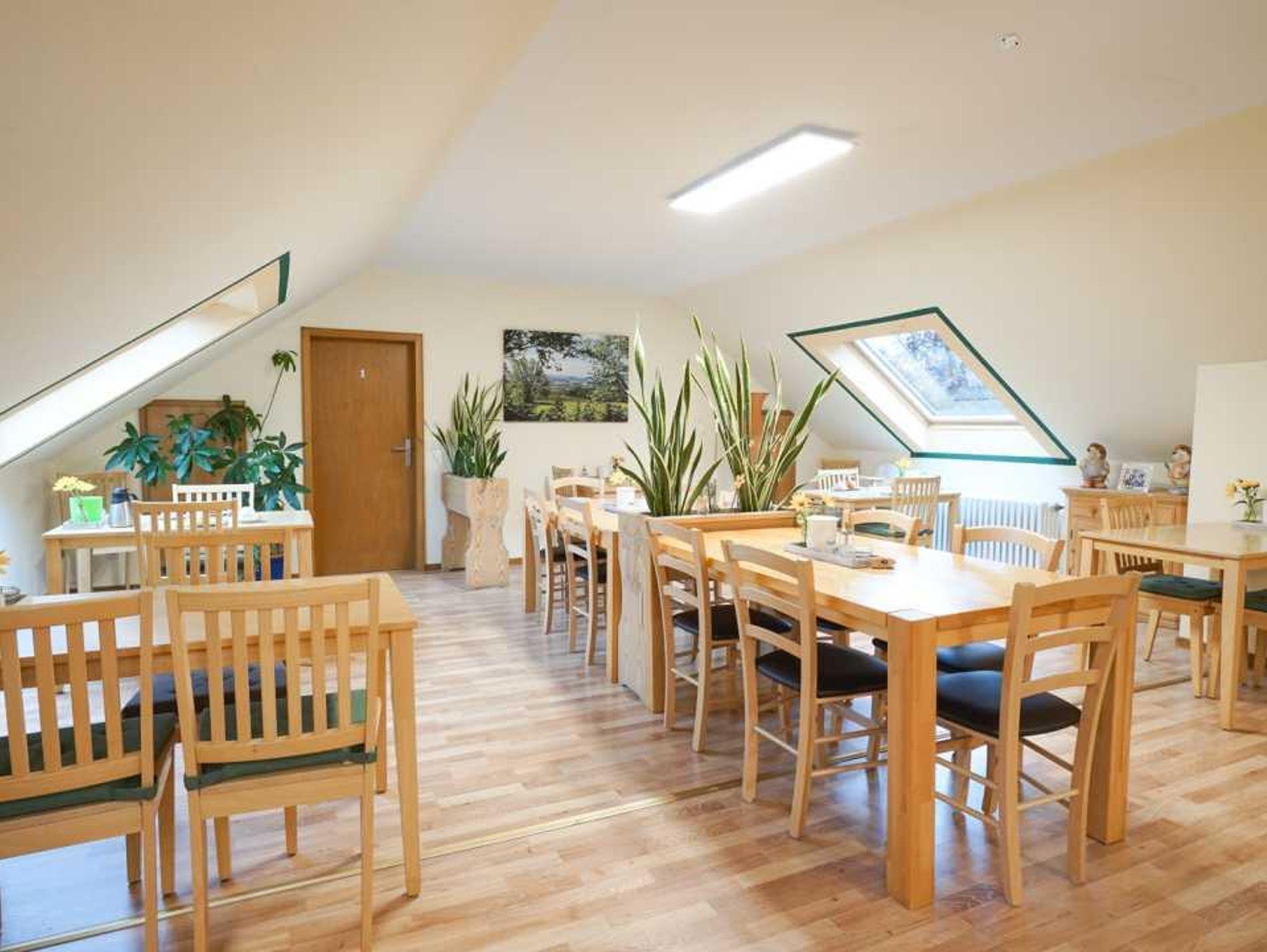 Ein reichhaltiges mit regionalen Produkten bestücktes Frühstück können Sie im gemeinschaftlichen Aufenthaltsraum in aller Ruhe zu sich nehmen. Dort finden Sie auch eine Teeküche, einen Kühlschrank mit Getränken, Gesellschaftsspiele und eine kleine Bibliothek, die Sie gerne benutzen dürfen. Gute Restaurants finden Sie in unmittelbarer Nähe des Hotels im Ort Poppenhausen.