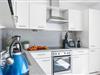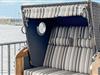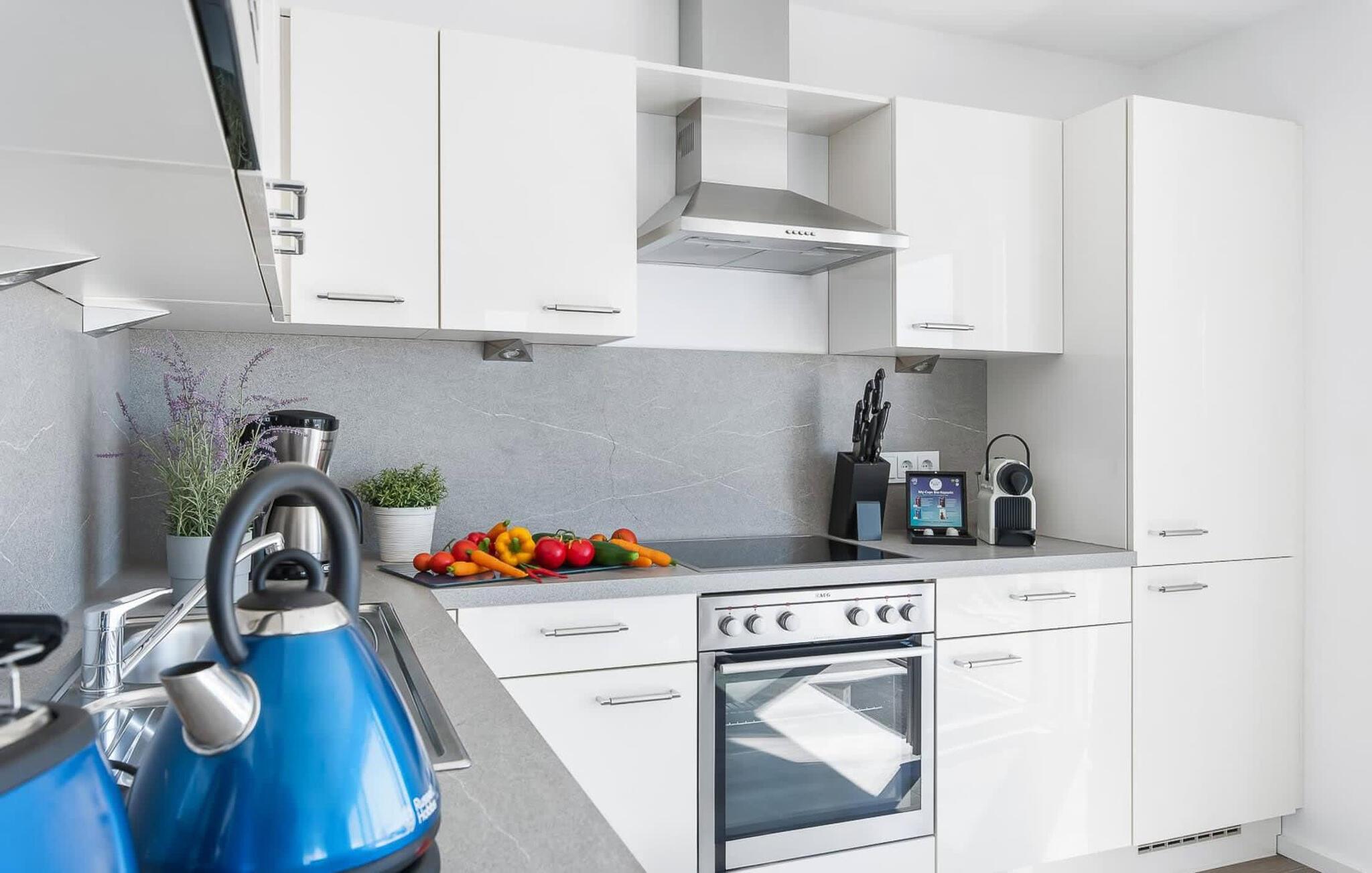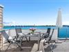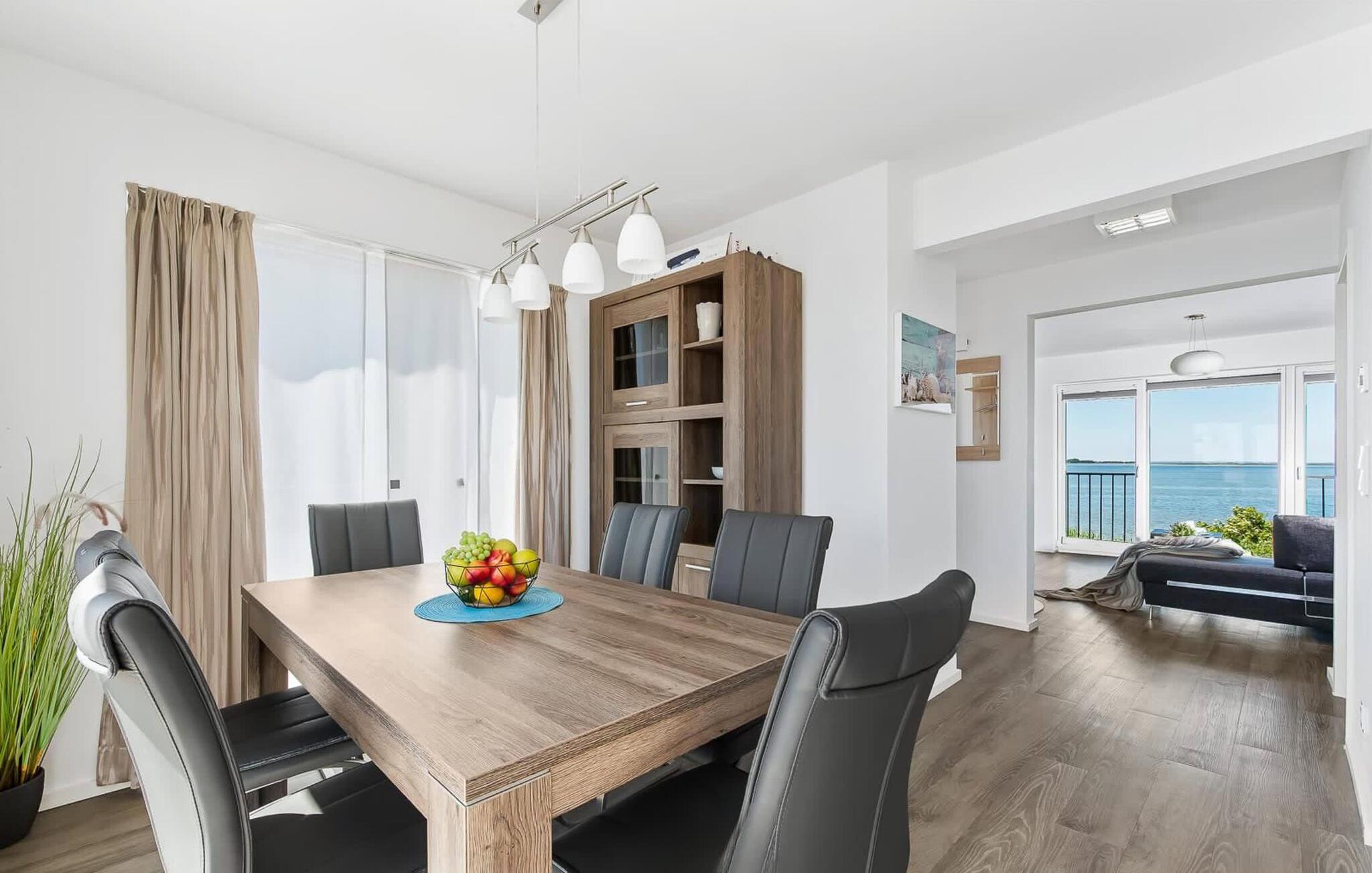 Die voll ausgestattete Wohnküche ist zur Hafenseite hin ausgerichtet und erlaubt einen freien Blick auf das Hafenkino. Vor bodentiefen Fenstern lädt ein massiver Esstisch für sechs Personen zu Urlaubsmahlzeiten ein. Von hier aus gelangt man auf die direkt angrenzende Terrasse mit Süd-Süd-West Ausrichtung.