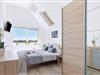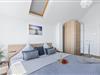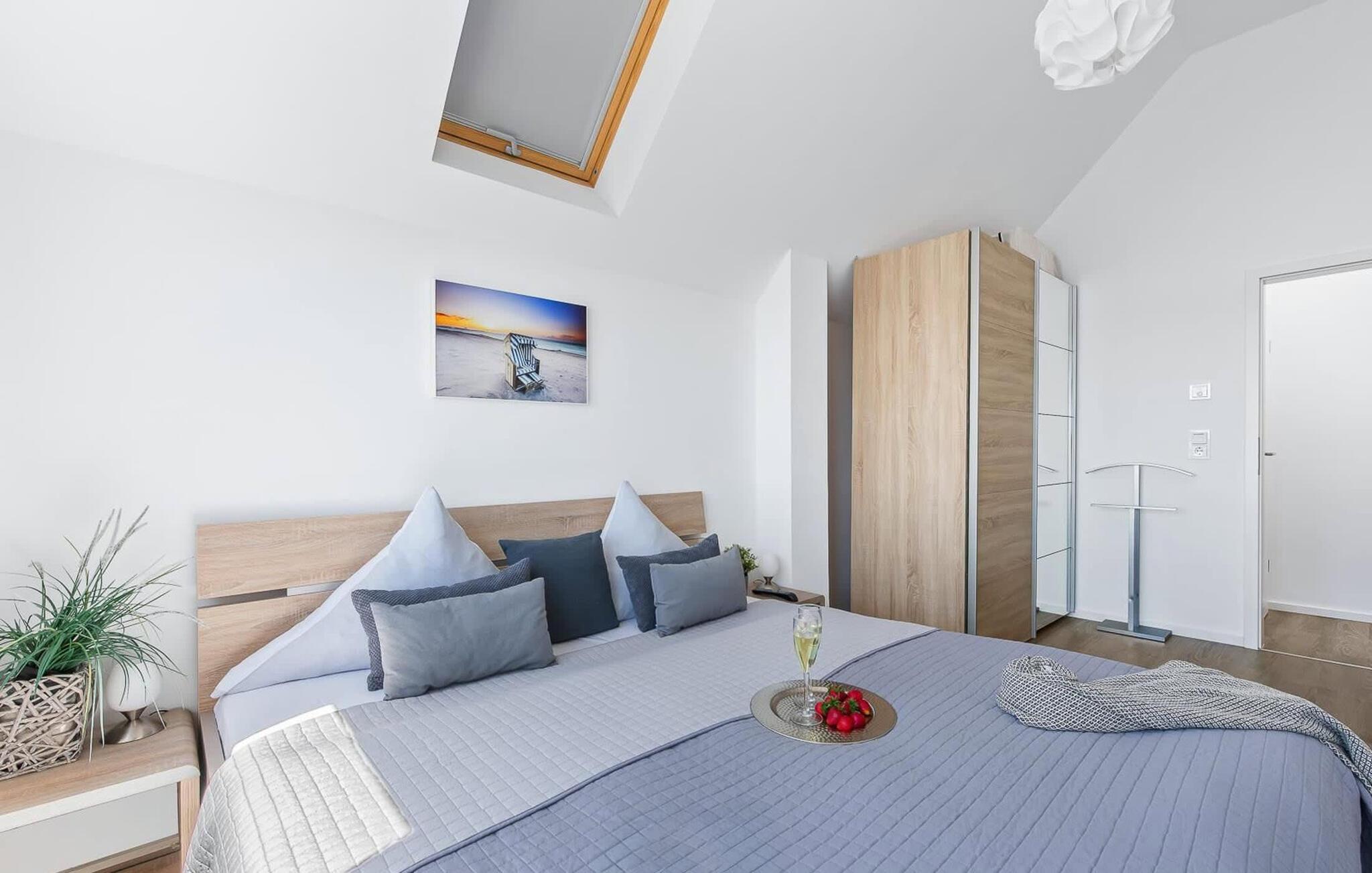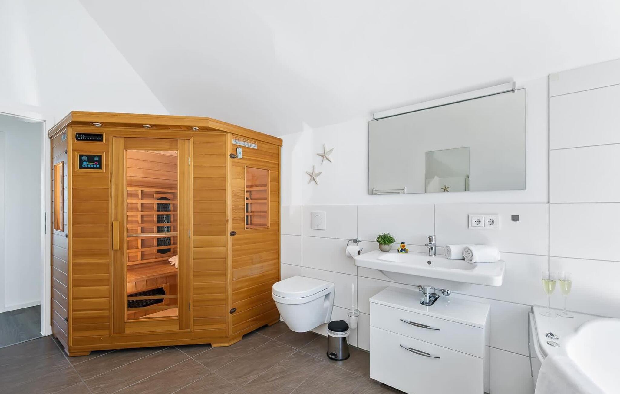 Auf der obersten Wohnebene befindet sich der Schlafbereich. Beide Schlafzimmer bieten mit Wasserblick pure Erholung, während hohe Decken und Schrägen für eine besondere Gemütlichkeit sorgen. Das Hauptschlafzimmer verfügt über einen zusätzlichen TV. Zwei weitere Schlafplätze befinden sich auf der komfortablen Schlafcouch im Wohnbereich. Wellness bei Schleiblick bietet das voll ausgestattete Badezimmer auf der oberen Ebene mit Sauna (Infrarotkabine) und Whirlpool-Badewanne. Für zusätzlichen Komfort sorgt ein Duschbad auf der ersten Wohnungsebene.