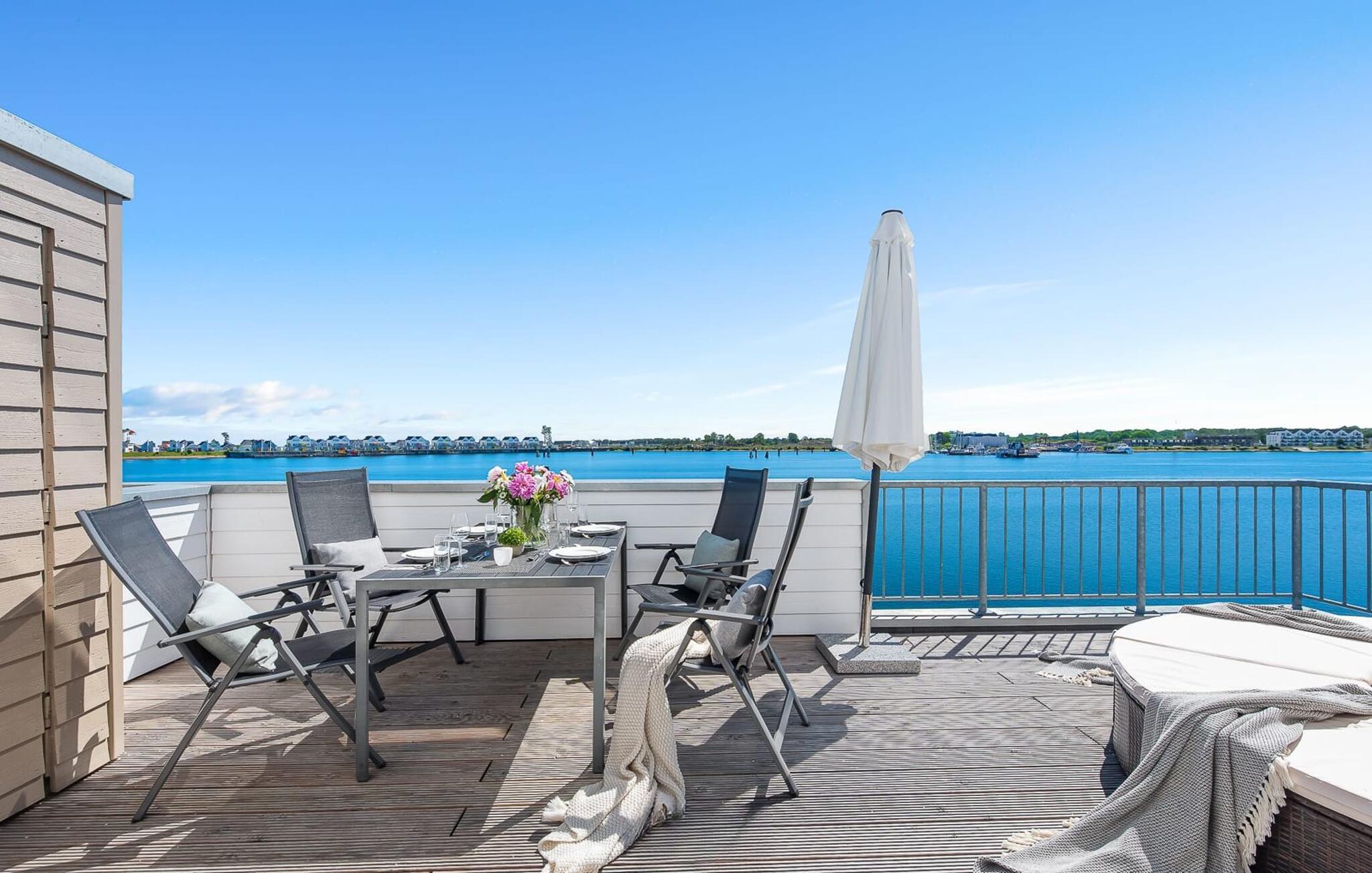 Die voll ausgestattete Wohnküche ist zur Hafenseite hin ausgerichtet und erlaubt einen freien Blick auf das Hafenkino. Vor bodentiefen Fenstern lädt ein massiver Esstisch für sechs Personen zu Urlaubsmahlzeiten ein. Von hier aus gelangt man auf die direkt angrenzende Terrasse mit Süd-Süd-West Ausrichtung. Highlight der großzügigen Terrasse ist die stylische Sonneninsel in Lounge-Optik mit optimalem Windschutz.