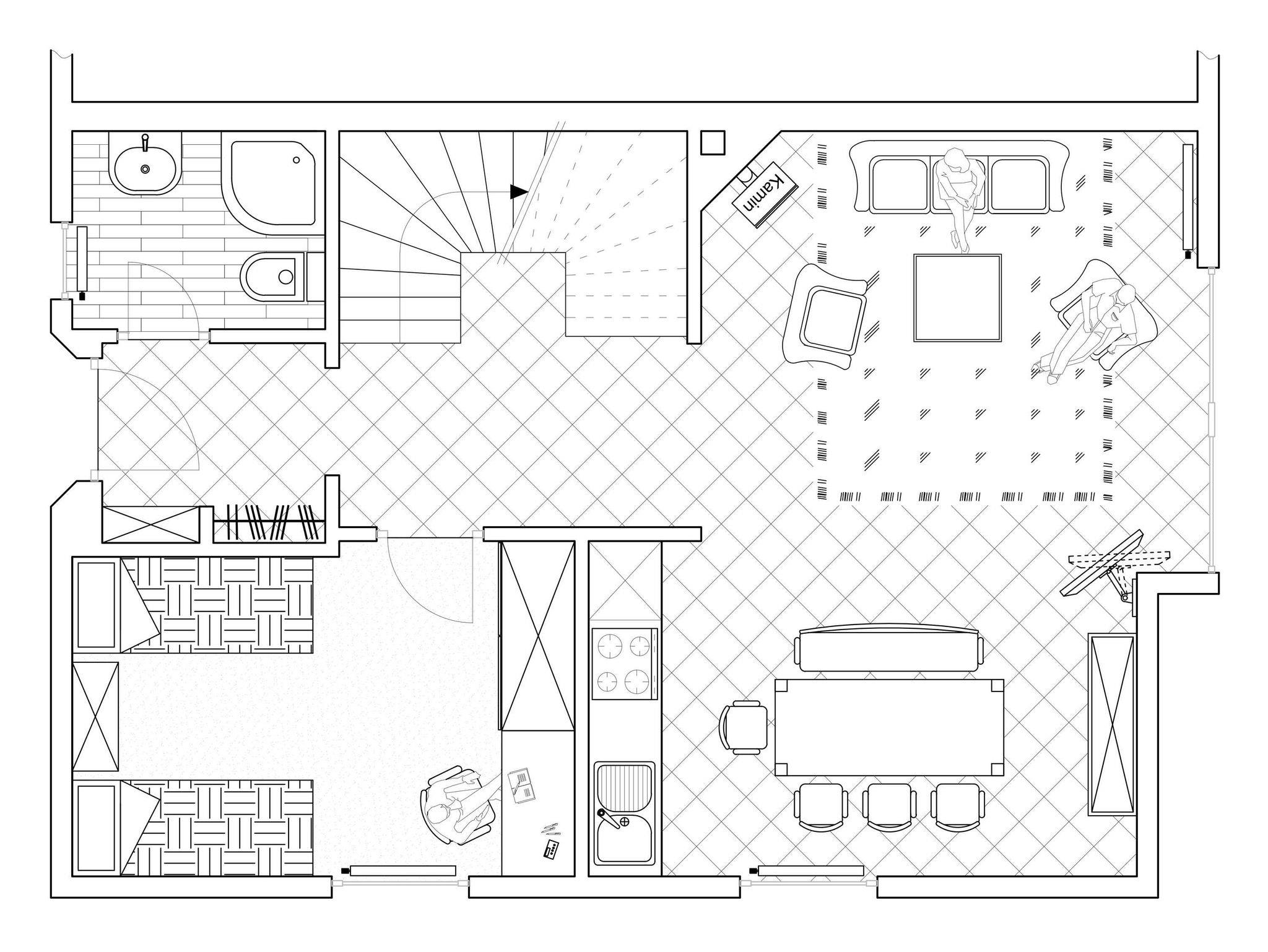 - OG: 2 Schlafräume (je 1 Doppelbett), Bad mit Wanne / WC und Sauna