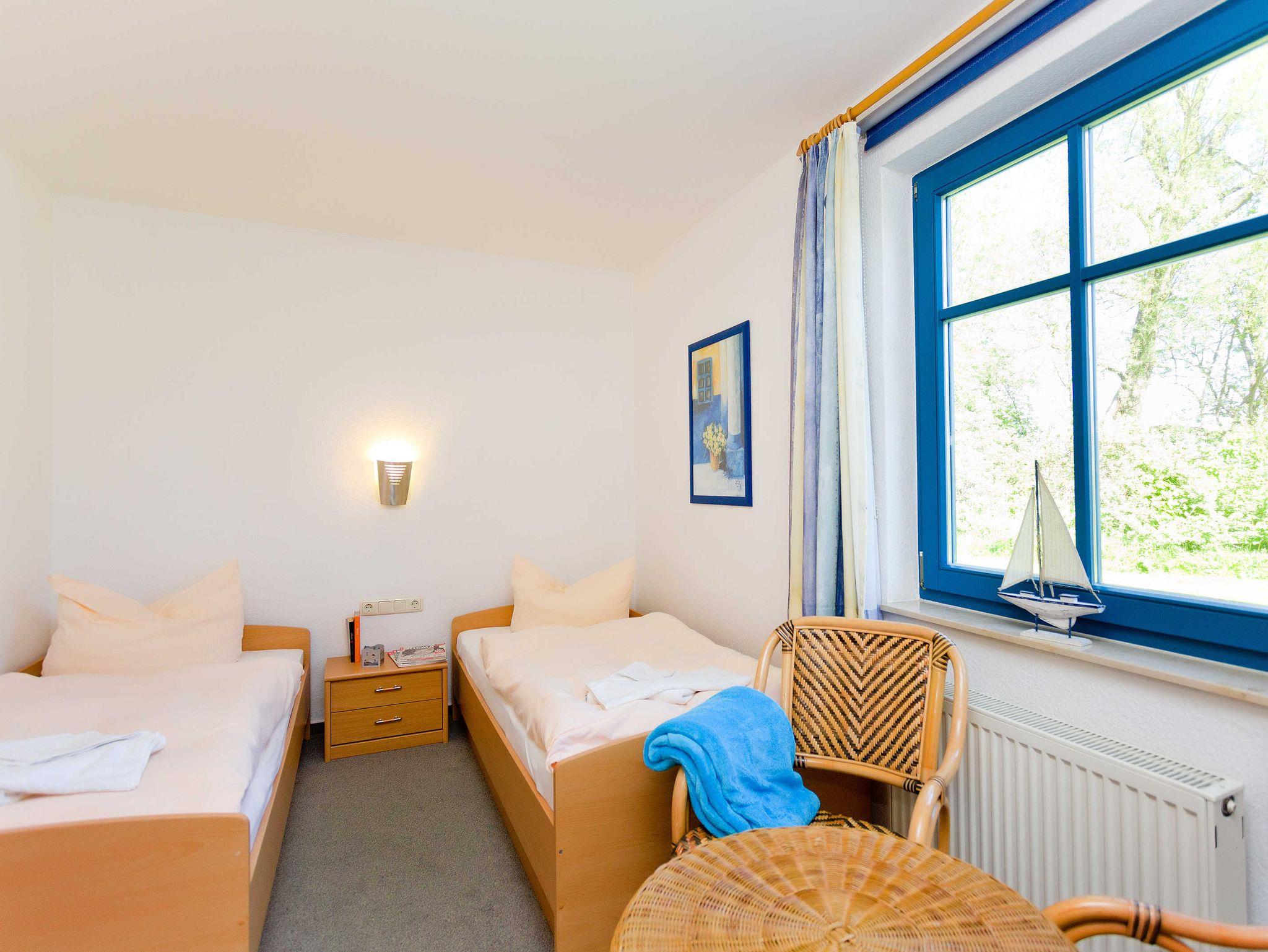 1 Schlafzimmer mit 2 Eimzelbetten und ein Duschbad