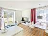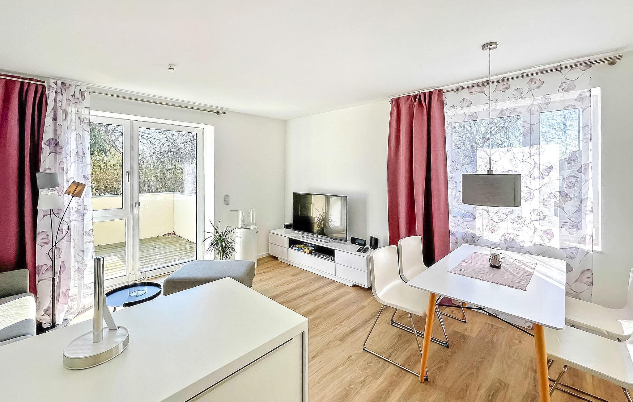 Diese hochwertige Nichtraucherwohnung mit separatem Eingang und Fußbodenheizung ist ca. 51 m² groß und für 2 Erwachsene und 2 Kinder (bis 14 Jahre) geeignet. Es verfügt über ein großes Wohnzimmer (Sofa, Esstisch, Flachbildfernseher, Radio) mit offener Küche (E-Herd mit Backofen, Kühlschrank mit Gefrierfach, Geschirrspüler, diverse kleine Küchengeräte), zwei Schlafzimmer (1 x Doppelbett, 1 x Durchgangszimmer mit Kleiderschrank-Etagenbett - max. Belastung im Obergeschoss 70 kg!), einem großen Badezimmer (bodengleiche Dusche, WC, Elektroheizung) und einer möblierten Terrasse. Bei Bedarf können ein Hochstuhl und ein Kinderbett bereitgestellt werden.