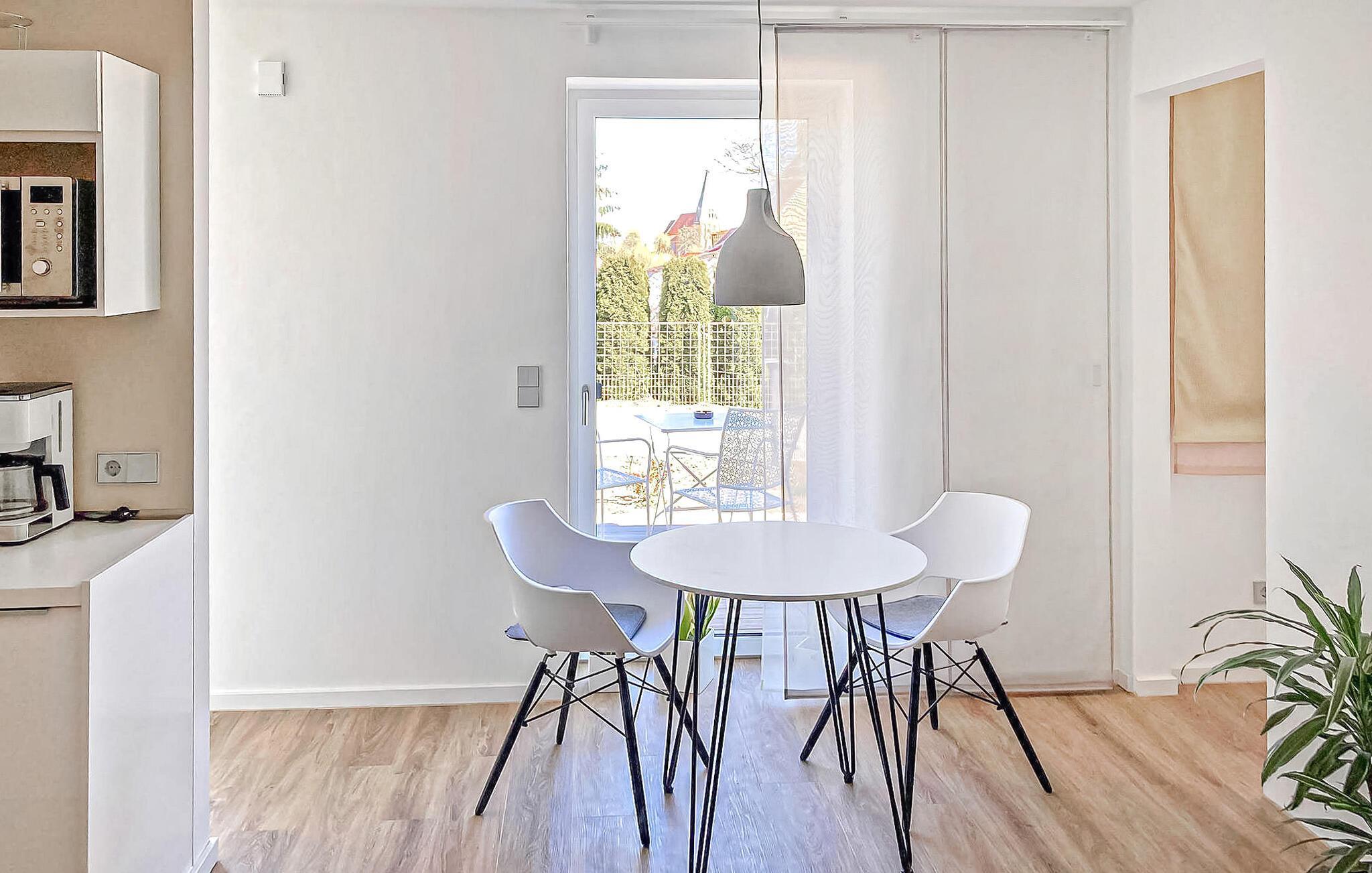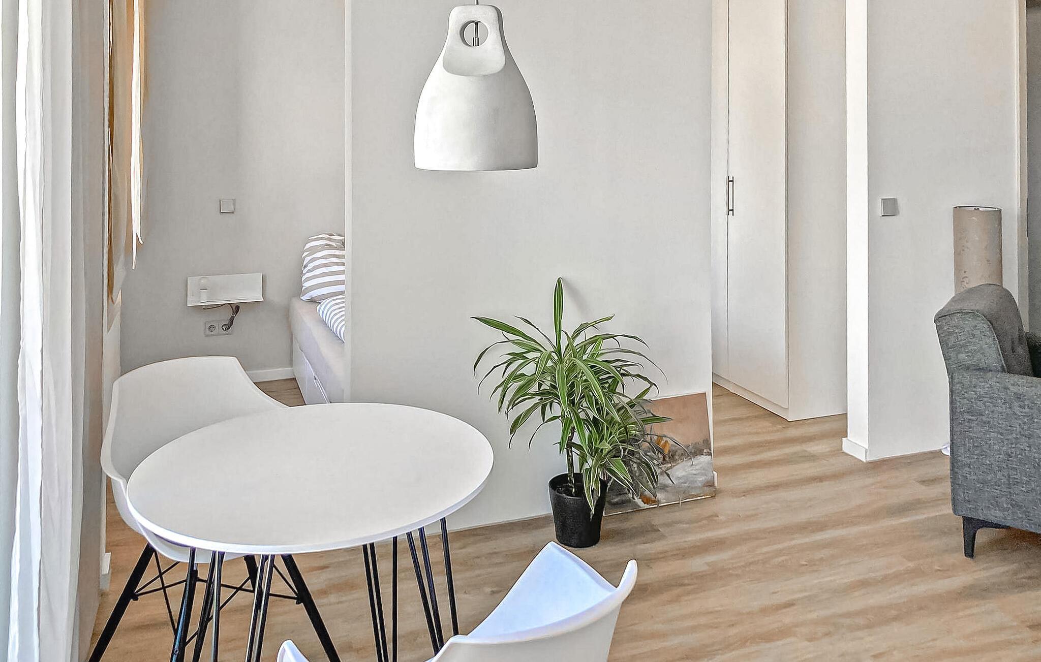 Es verfügt über ein großes Wohnzimmer (Polsterecke, Essecke, Flachbild-TV, Radio) mit offenem Küchenbereich (Cerankochfeld, Mikrowelle, Kühlschrank mit Gefrierfach, Geschirrspüler, diverse kleine Küchengeräte) und Schlafzimmer (Doppelbett), ein Badezimmer (bodengleiche Dusche, WC) und eine möblierte Terrasse. Außerdem stehen Ihnen ein Auto Parkplatz, ein Grill, ein Fahrradkeller, Leihfahrräder, eine Gemeinschaftswaschmaschine und allgemeines WLAN zur Verfügung.