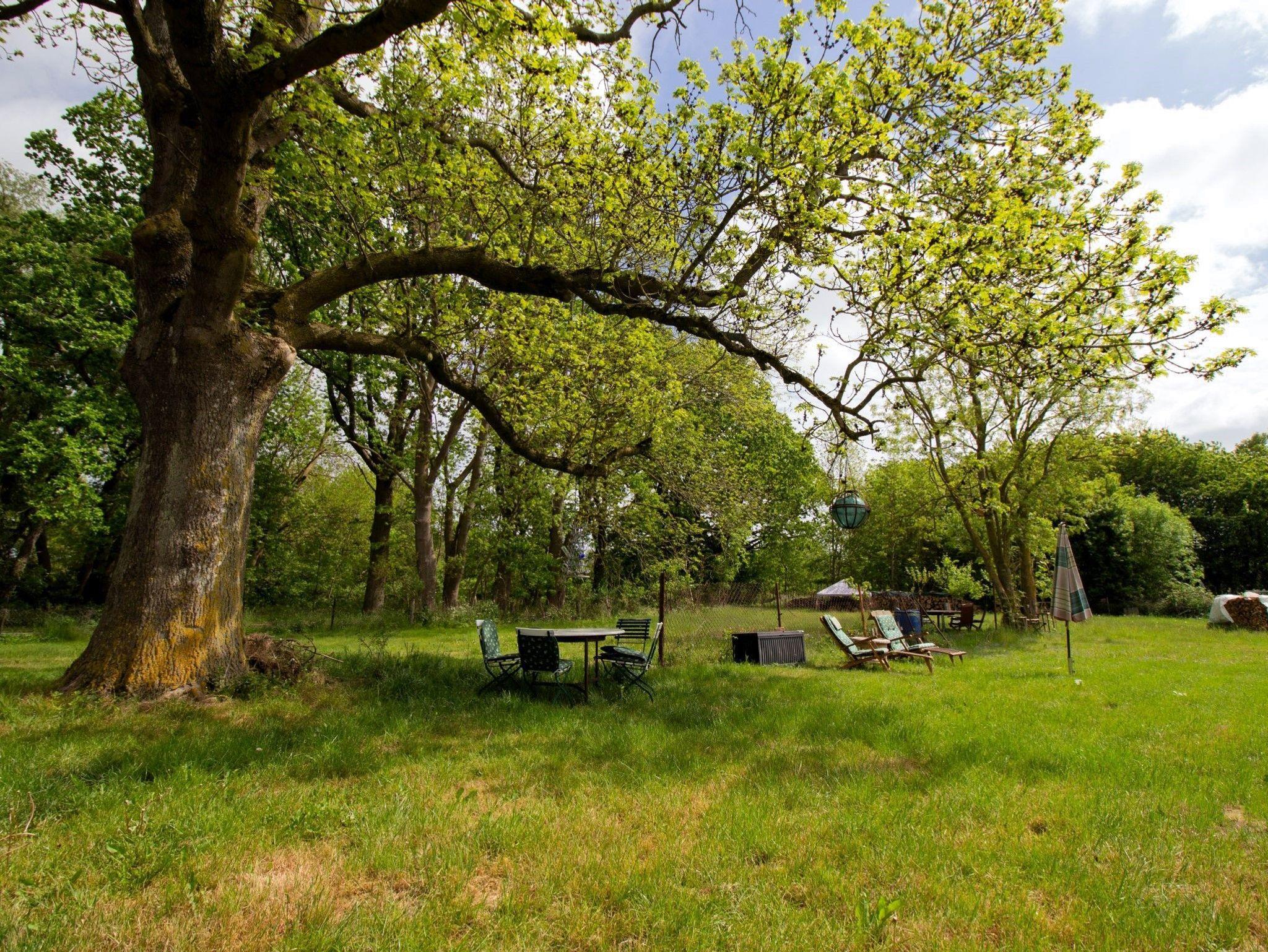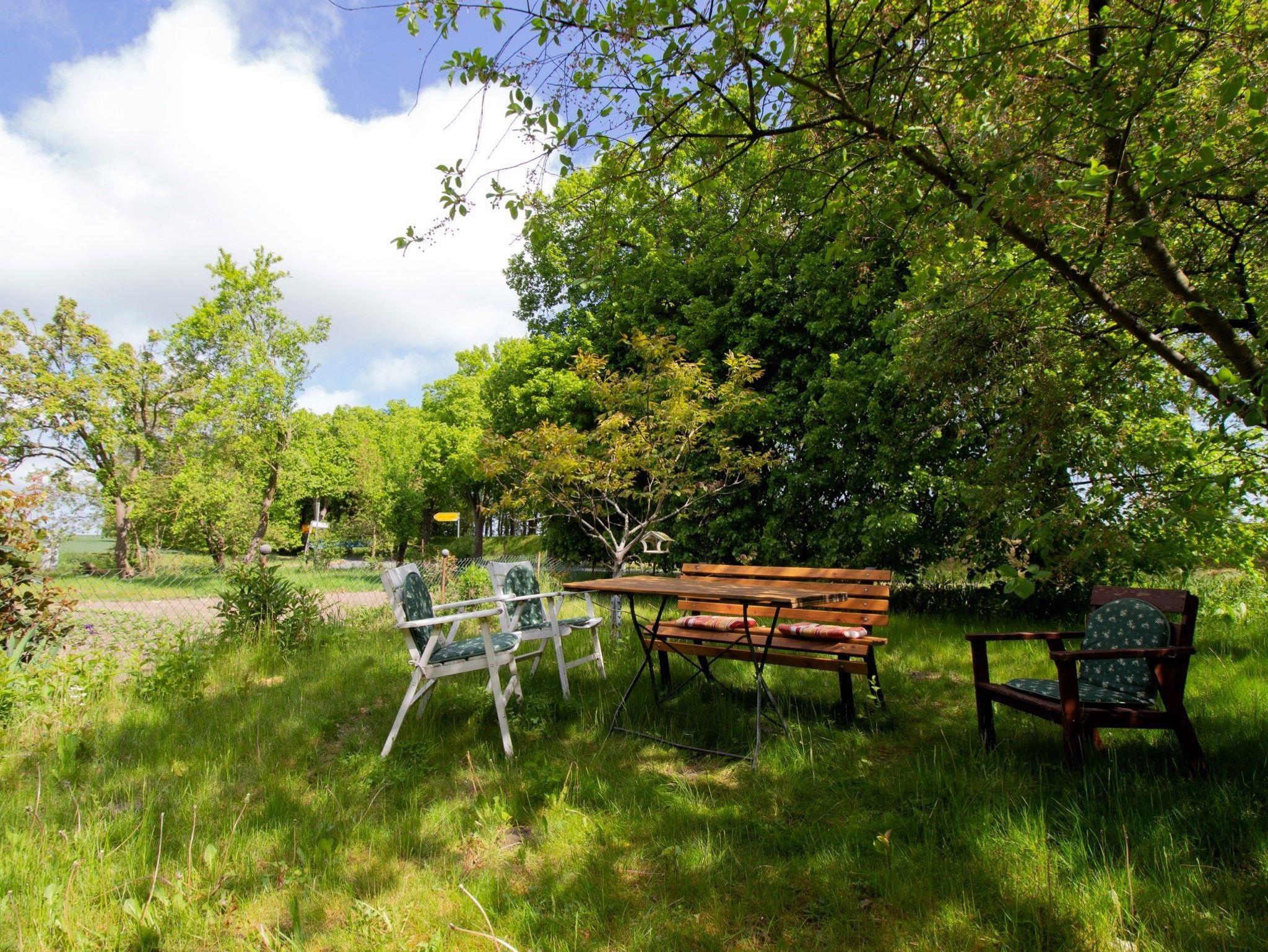 Das Landhaus liegt auf einem ca. 6400 qm großen Grundstück, bestehend aus typischen Bauerngärten mit Teich, Blumenbeeten, Gemüseanbau und Obstbäumen, weiten Wiesenflächen und schattenspendenden alten Bäumen.