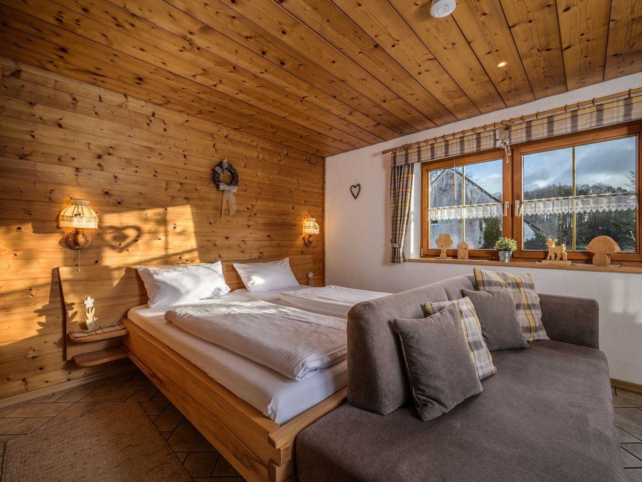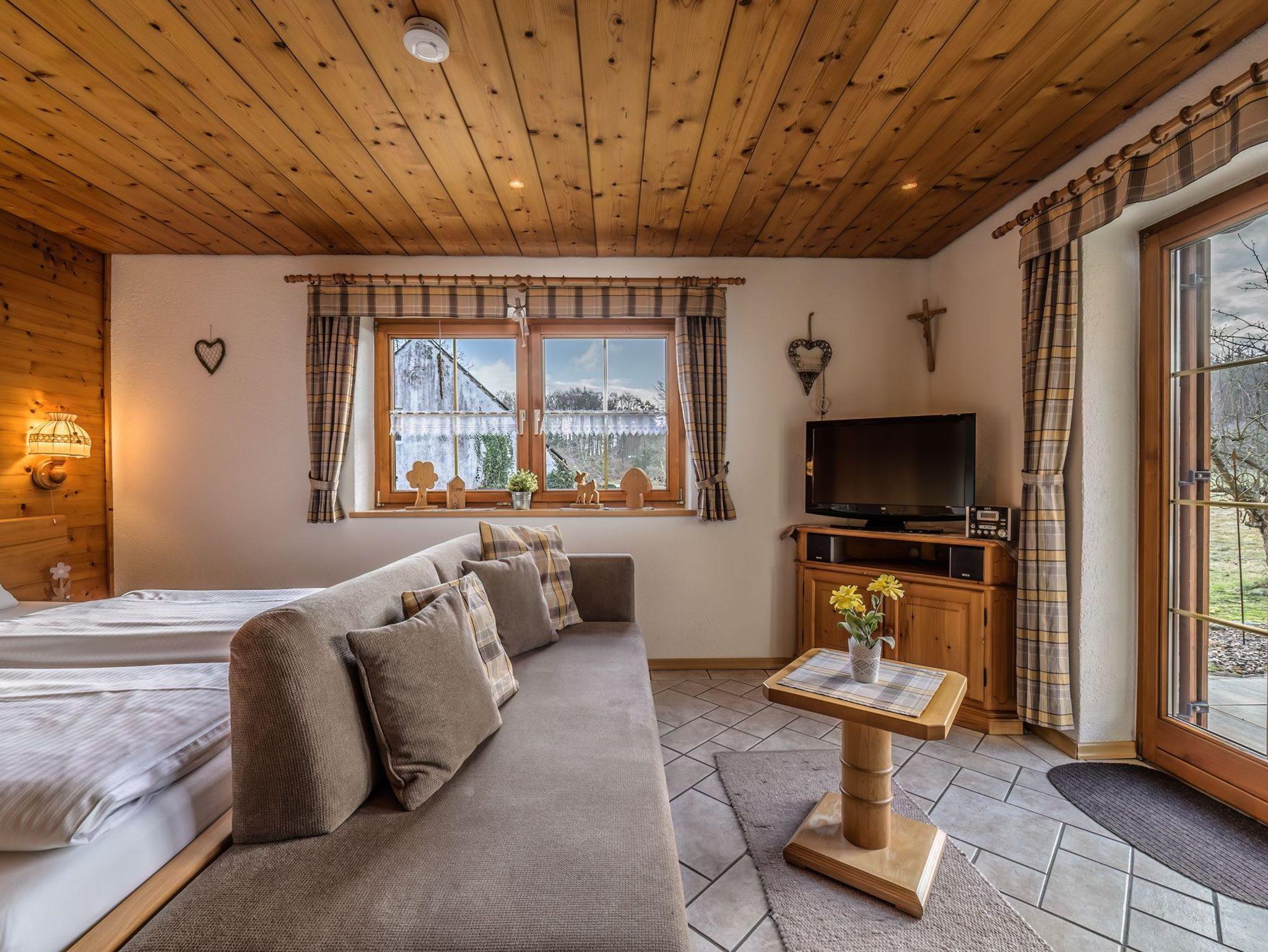 Wohn-Schlafraum mit Doppelbett, gemütlicher Couch und Sitzgruppe