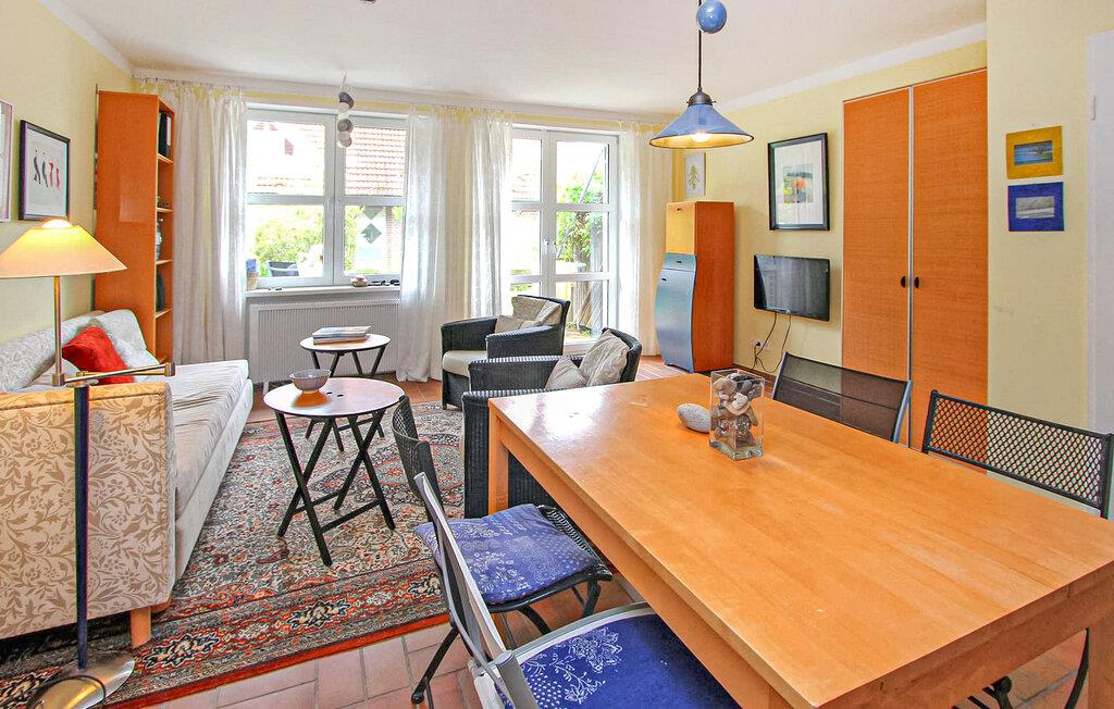 Die 49 qm große Zweiraum-Ferienwohnung für max. 2 Erwachsene und 2 Kinder befindet sich separat im Erdgeschoss eines Apartmenthauses in zentraler Lage. Restaurants, Einkaufsmöglichkeiten, der Hafen mit Fahrgastschifffahrt sowie der Ortskern befinden sich im Umkreis weniger hundert Meter. Der Ostseestrand ist ca. 700 m entfernt. Die Wohnung wurde im Jahr 2018 modernisiert und ist ausgestattet mit einem kombinierten Wohn-/Esszimmer (Polstermöbel mit bequemer Schlaffunktion für 2 Personen, Flachbild-TV, Hifi), einer offenen Küchenzeile (Esstisch, E-Herd mit Backofen, Kühlschrank mit Tiefkühlteil, div. Küchengeräte), einem kleinen Schlafraum (franz. Doppelbett, 1,60 m x 2,00 m) sowie einem Bad mit DU/WC. Zur Verfügung stehen eine möblierte Terrasse, Grillmöglichkeit, Sonnenliegen und Parkplatz.